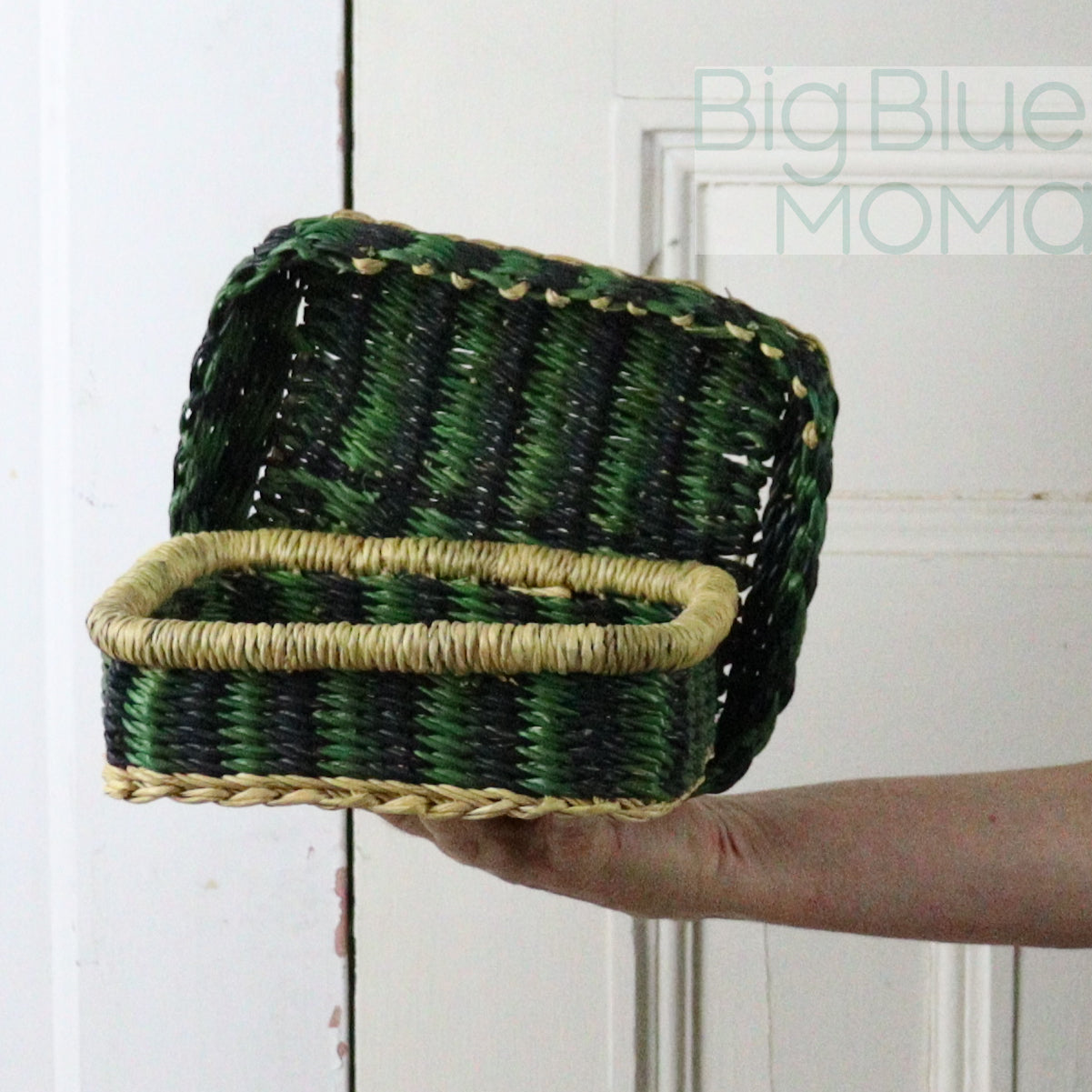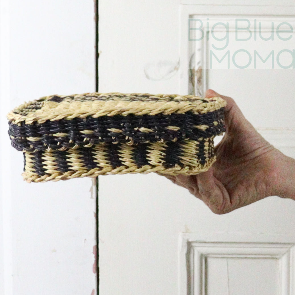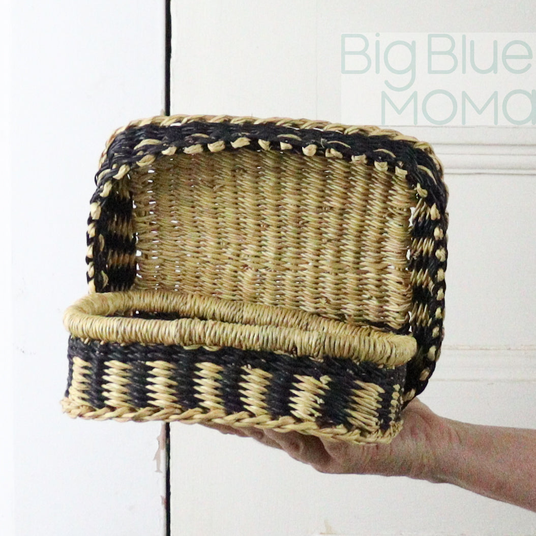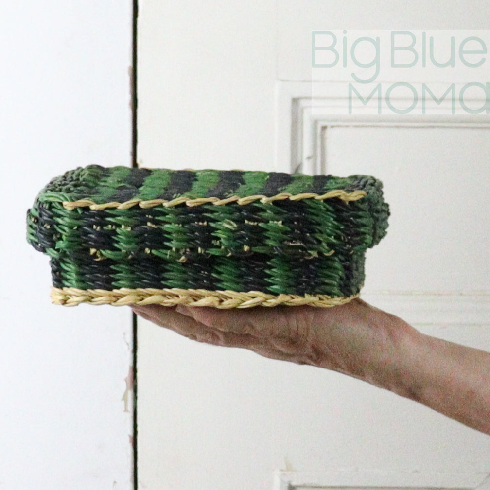 Woven from elephant grass with a snug-fitting lid, it brings order and warmth to desktops, dressers, and shelves. Each piece is handmade by Ghanaian artisans and features the unique textures and patterns of traditional weaving.