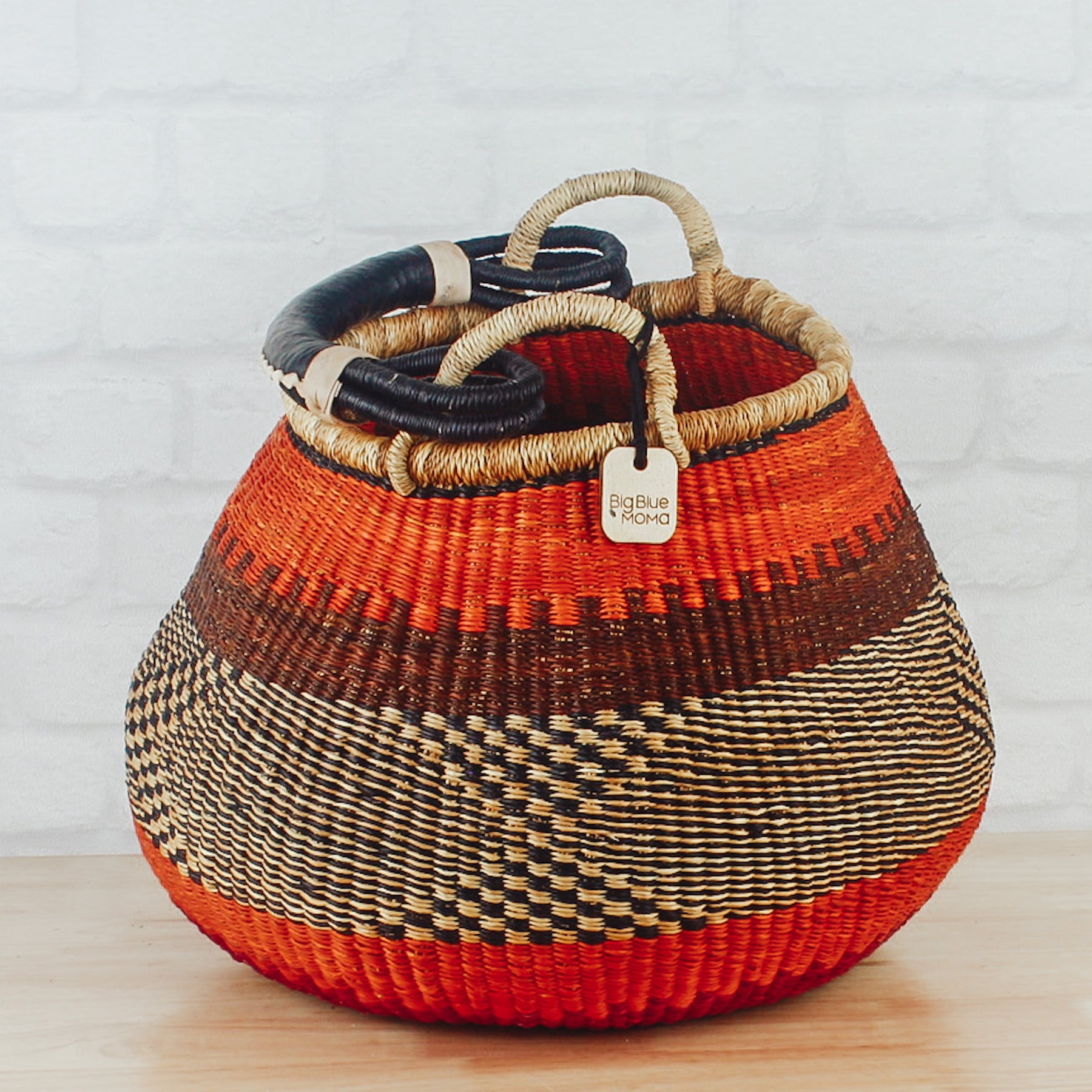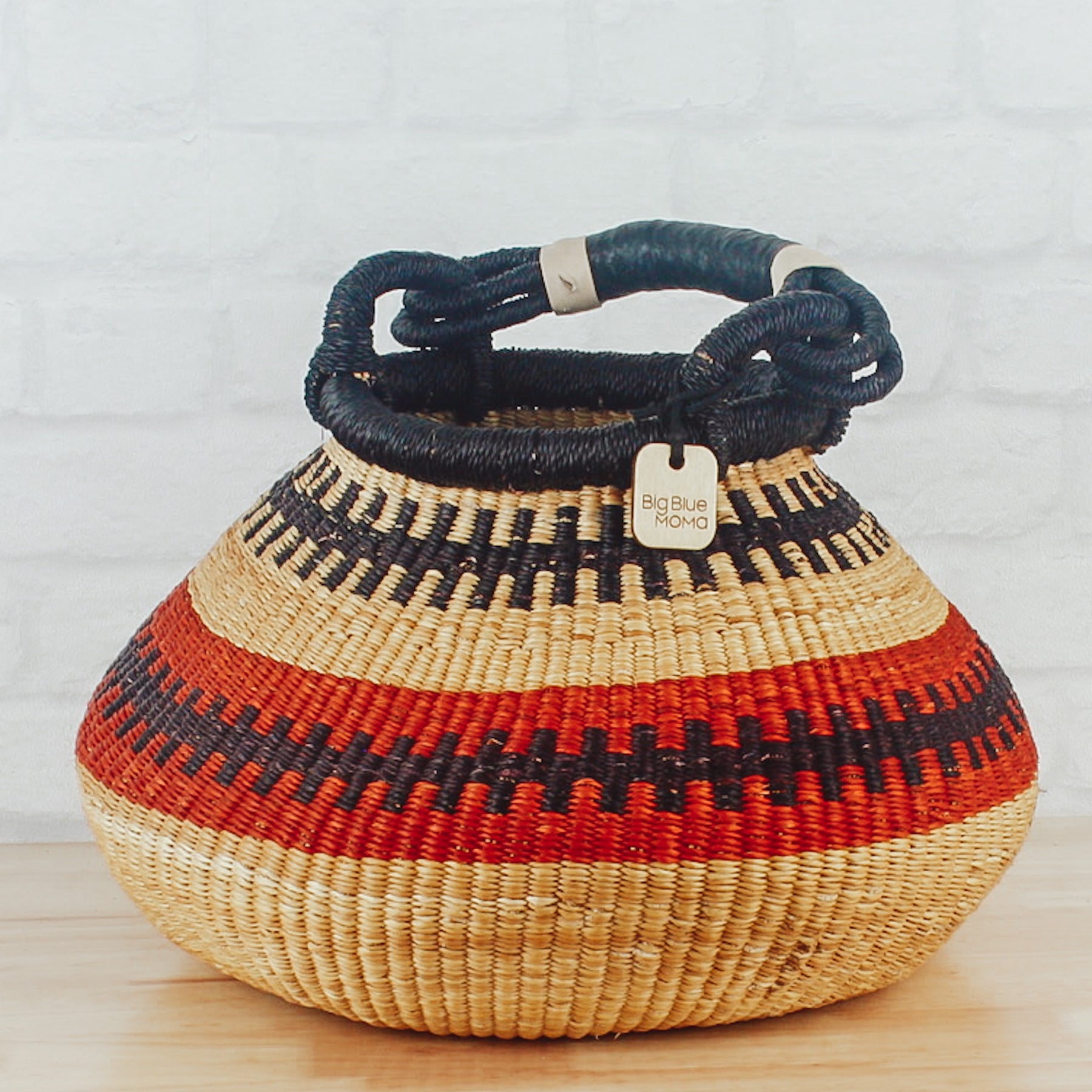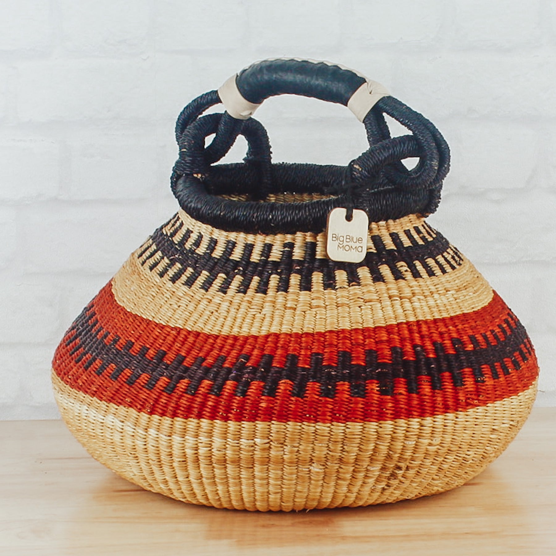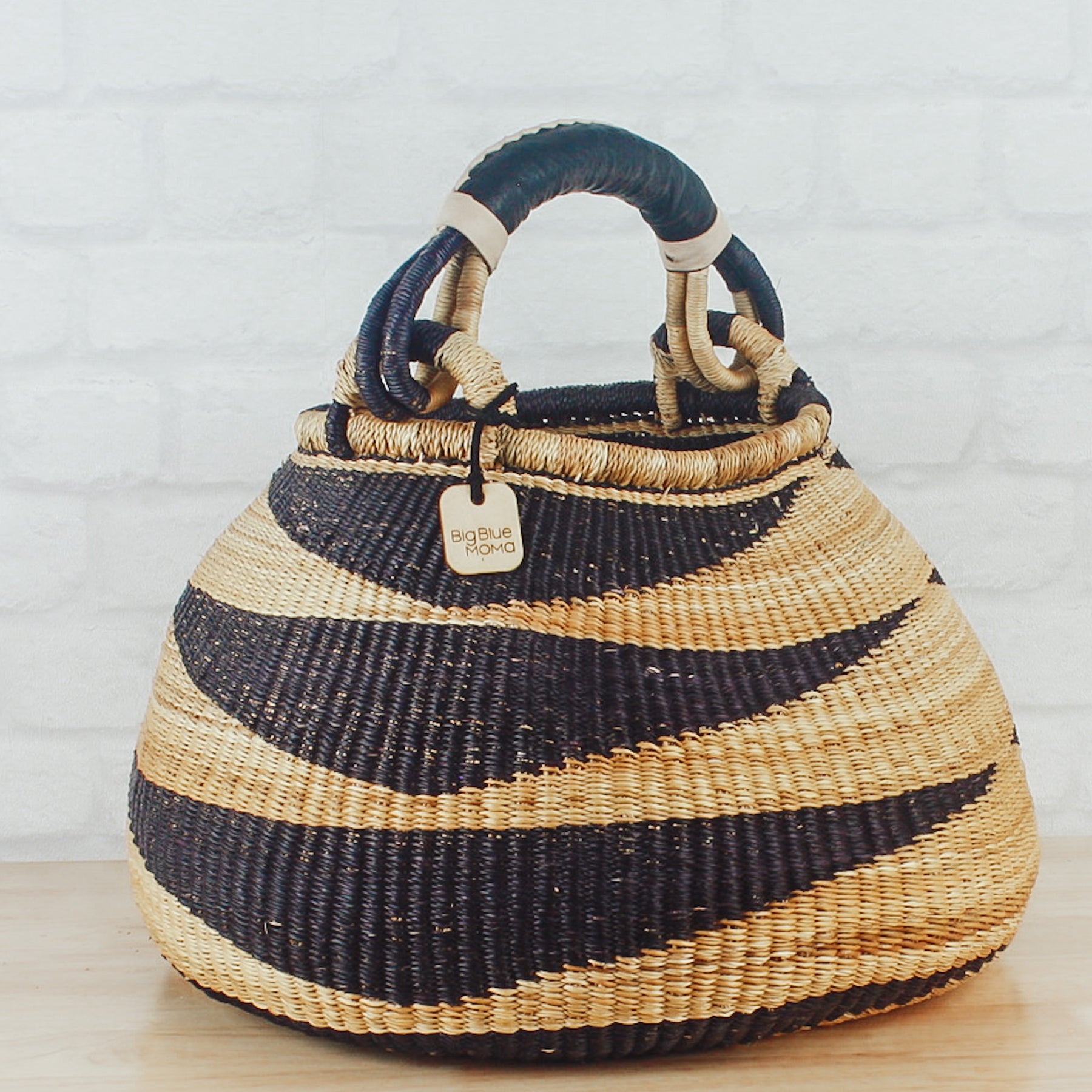 This is the most traditional basket shape we carry. The Gambibgo is made by only the master weavers because of it's shape. It's single handle and narrow mouth make it great for laundry, picnics or collecting odds and ends around the house. The black and white handle is a signature of the collective we buy from and the way you can know your neighbours basket also came from Big Blue Moma!