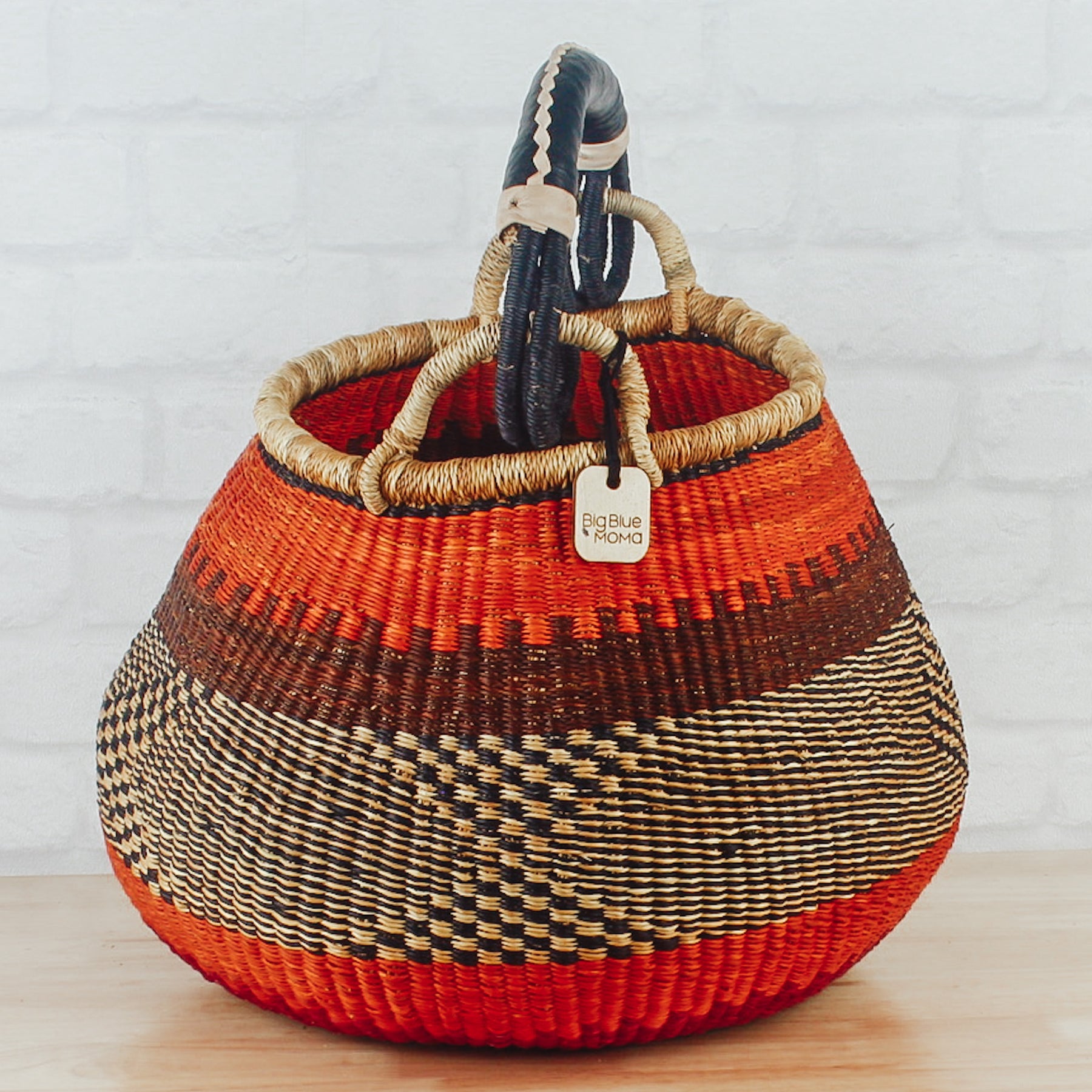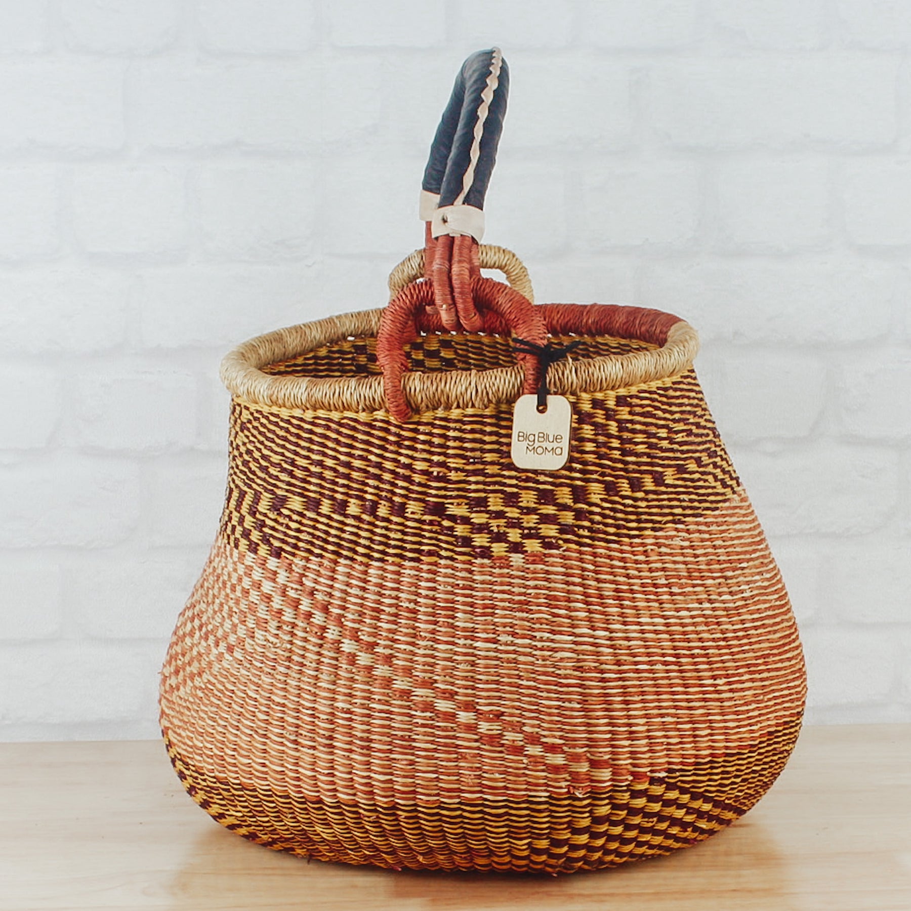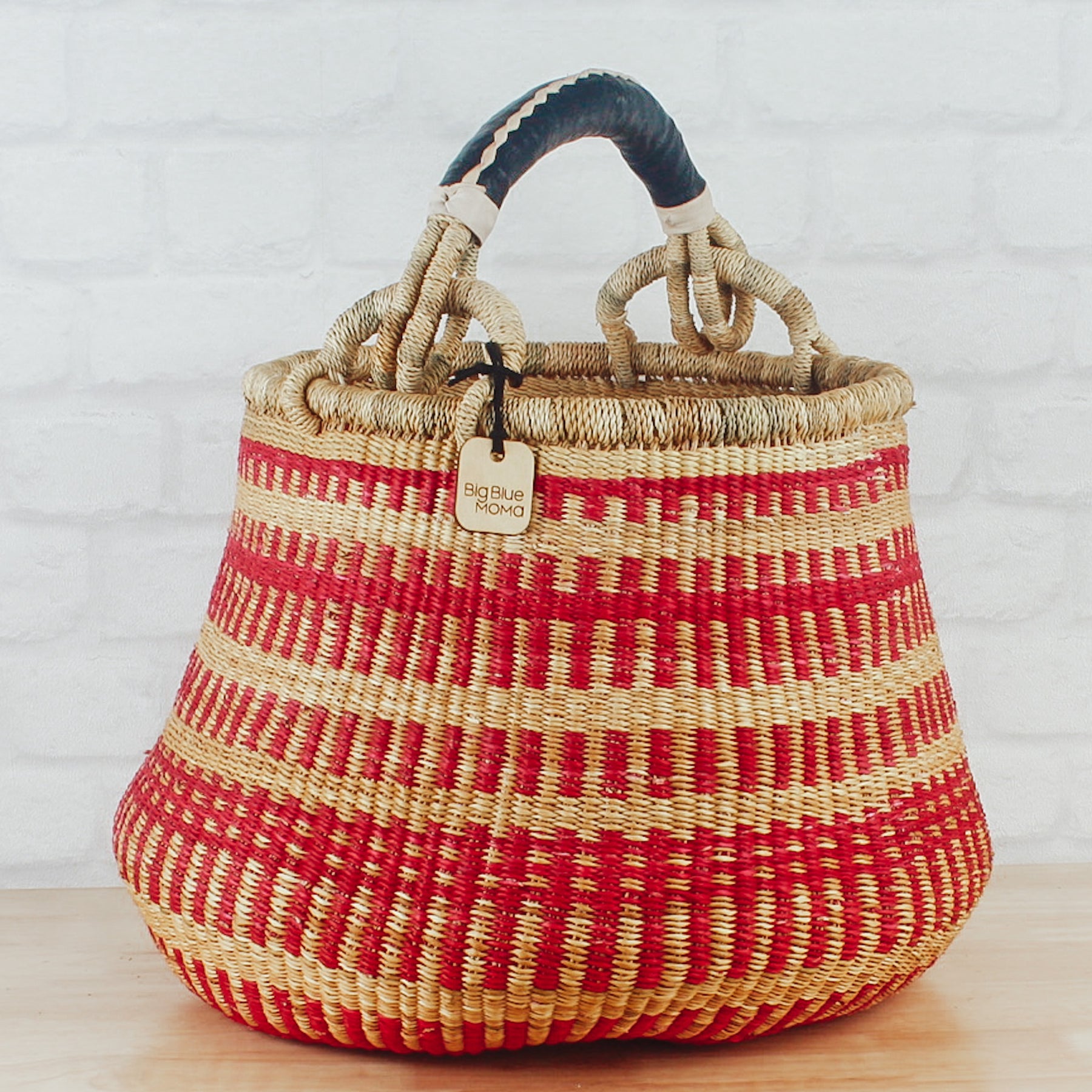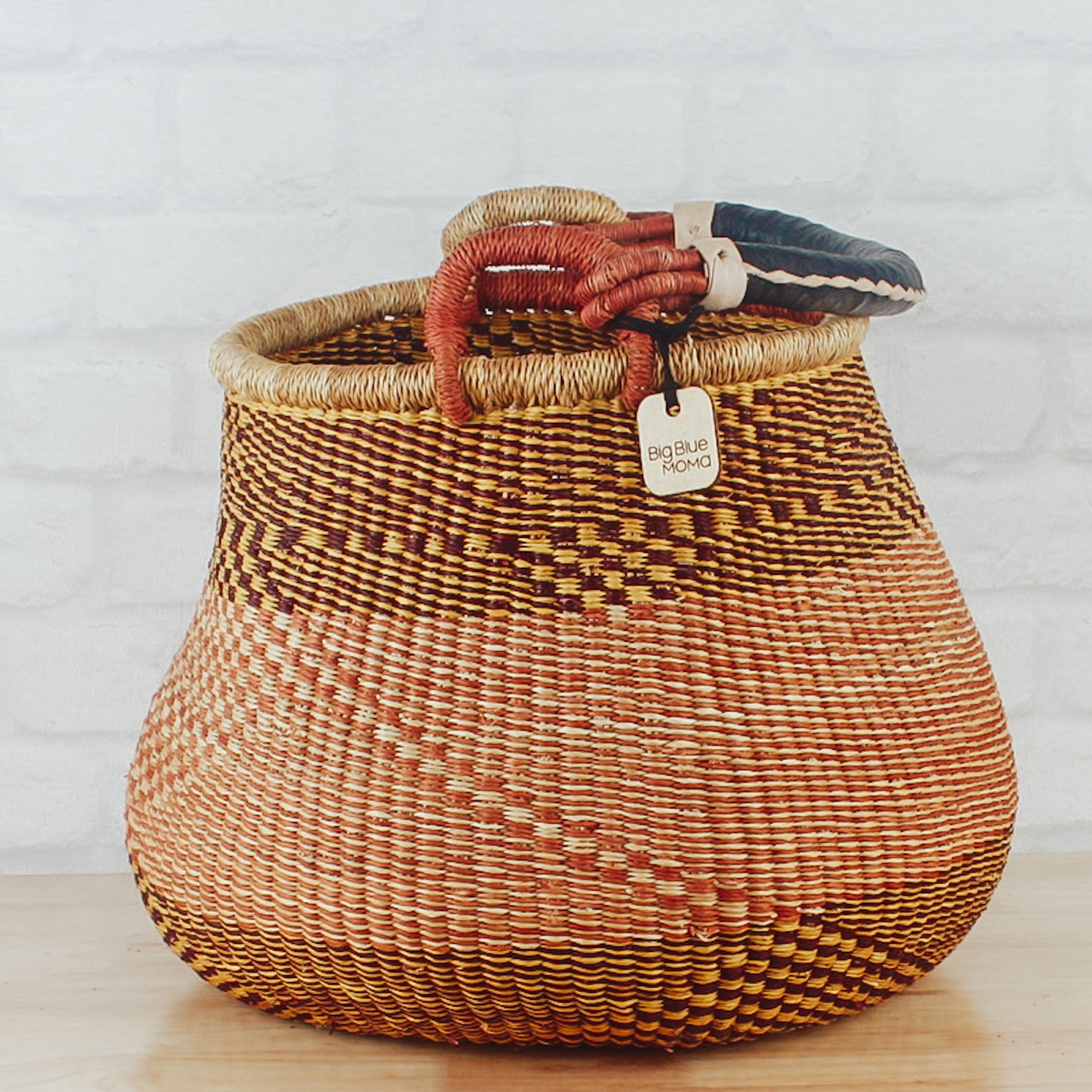 This is the most traditional basket shape we carry. The Gambibgo is made by only the master weavers because of it's shape. It's single handle and narrow mouth make it great for laundry, picnics or collecting odds and ends around the house. The black and white handle is a signature of the collective we buy from and the way you can know your neighbours basket also came from Big Blue Moma!