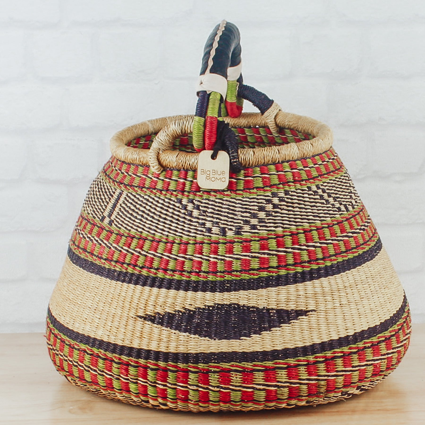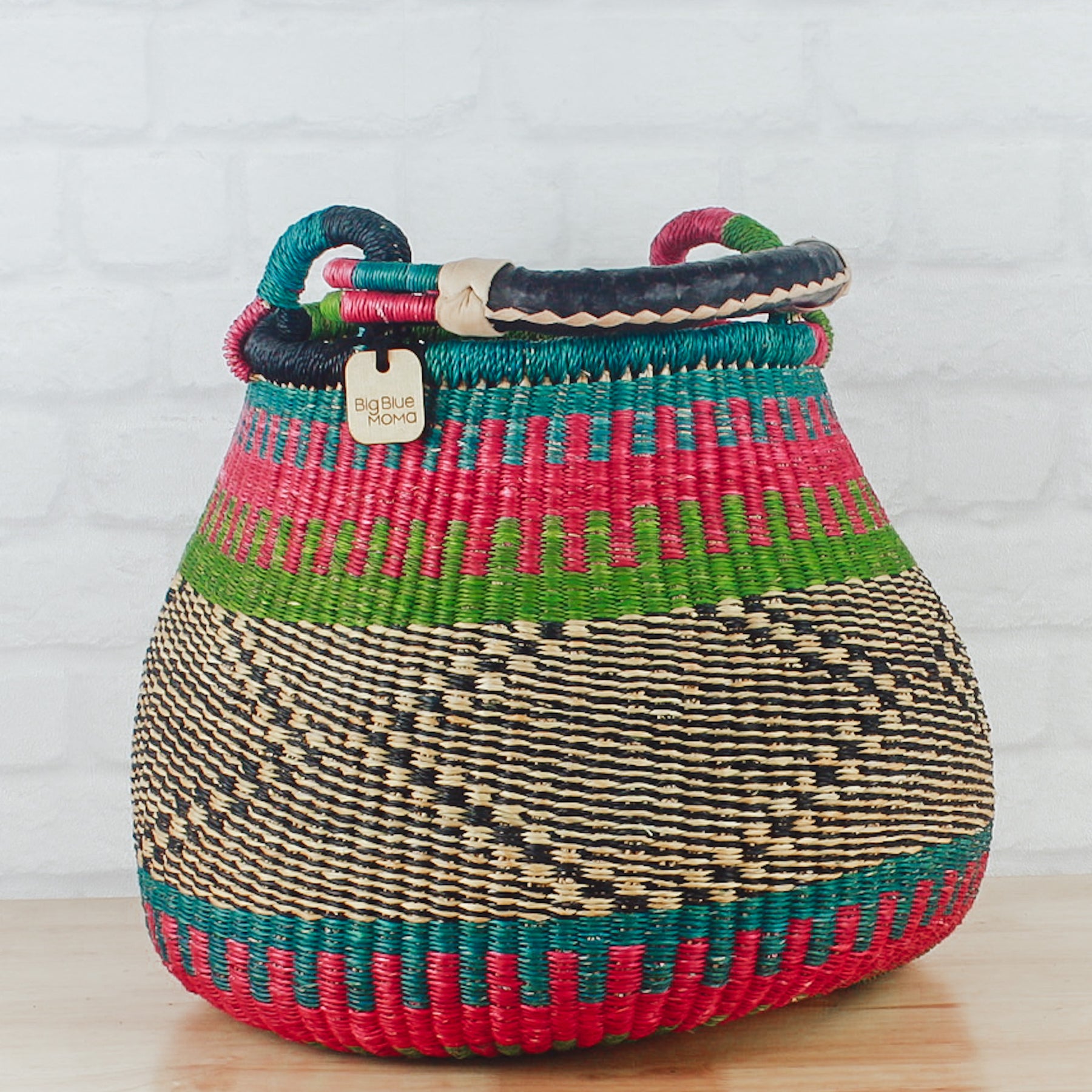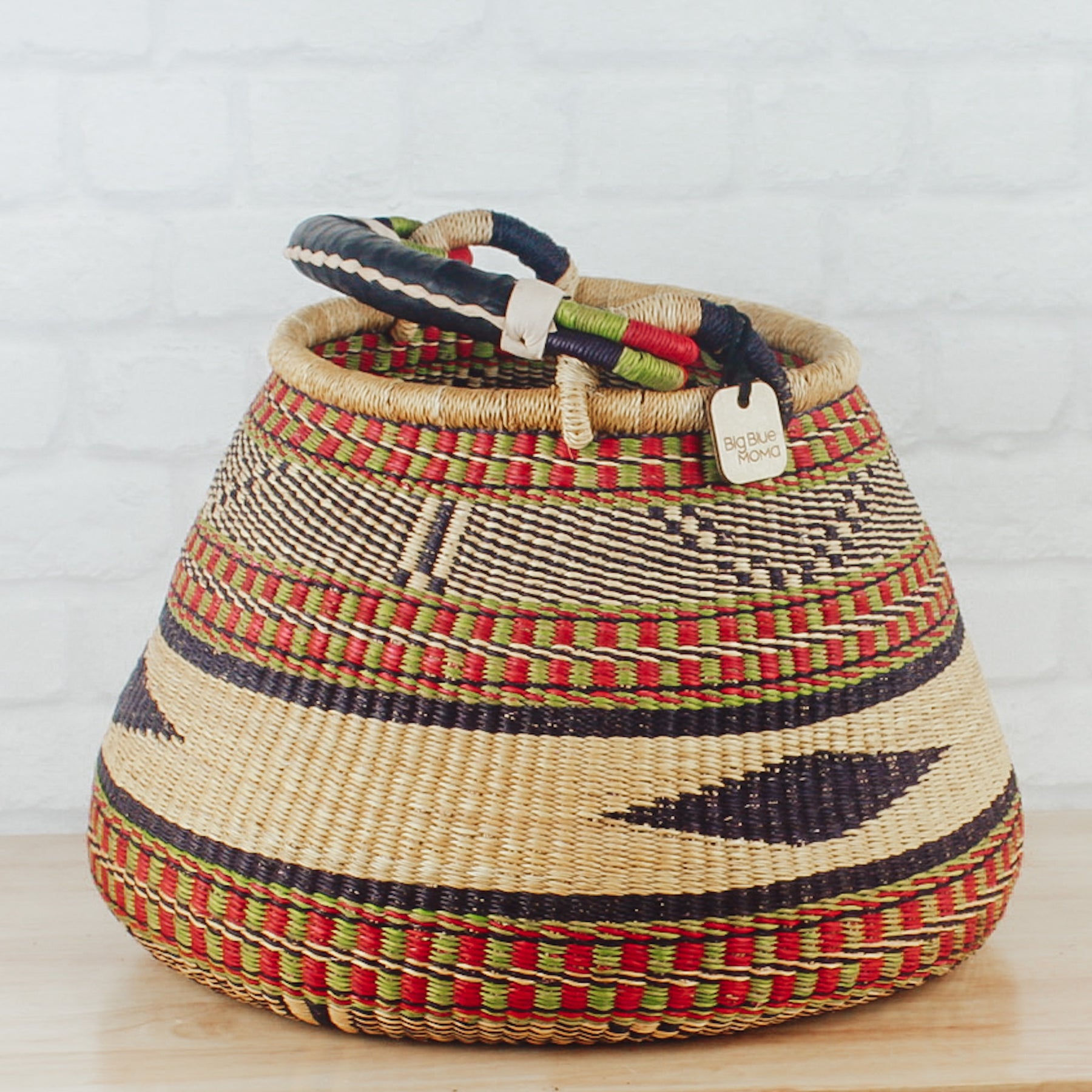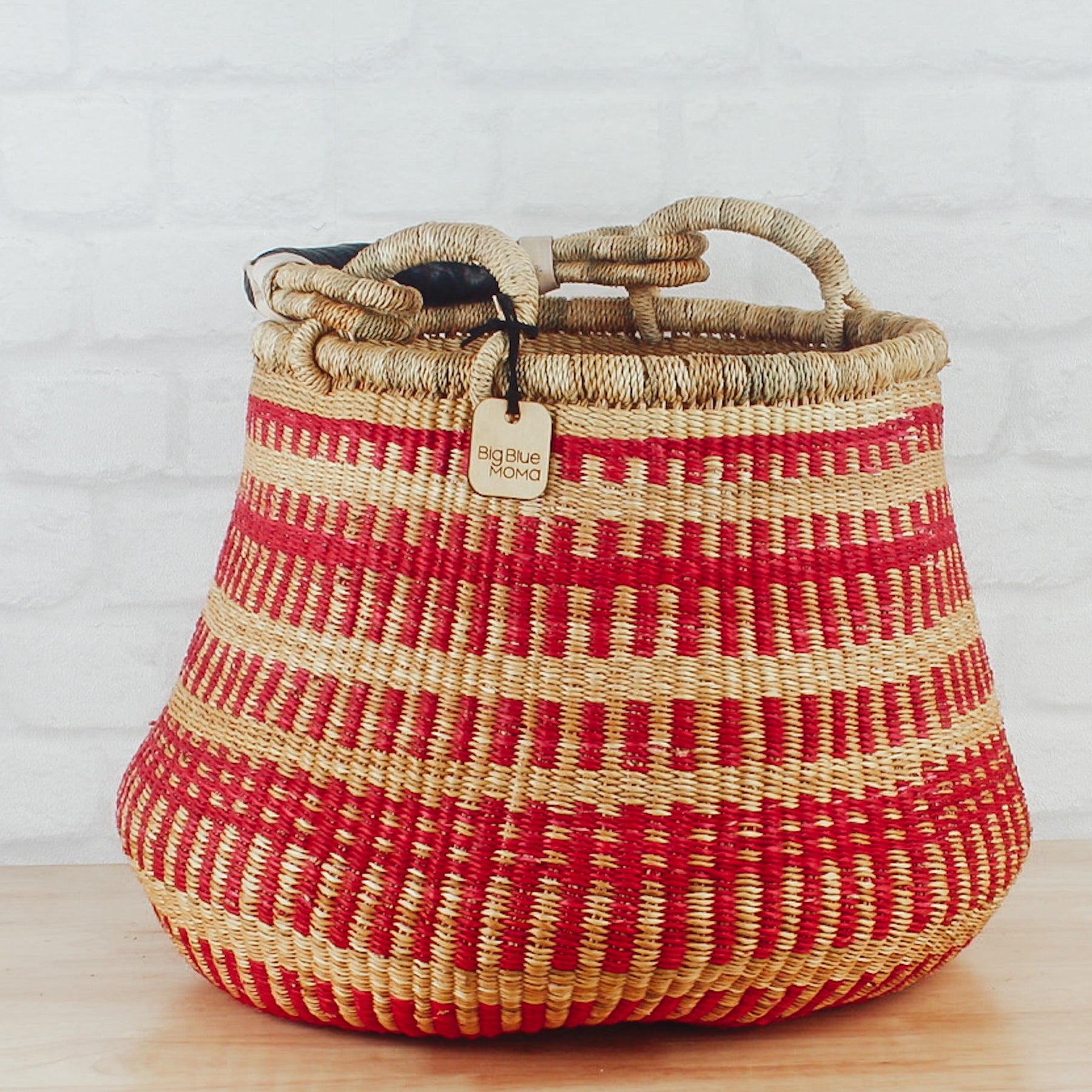 This is the most traditional basket shape we carry. The Gambibgo is made by only the master weavers because of it's shape. It's single handle and narrow mouth make it great for laundry, picnics or collecting odds and ends around the house. The black and white handle is a signature of the collective we buy from and the way you can know your neighbours basket also came from Big Blue Moma!