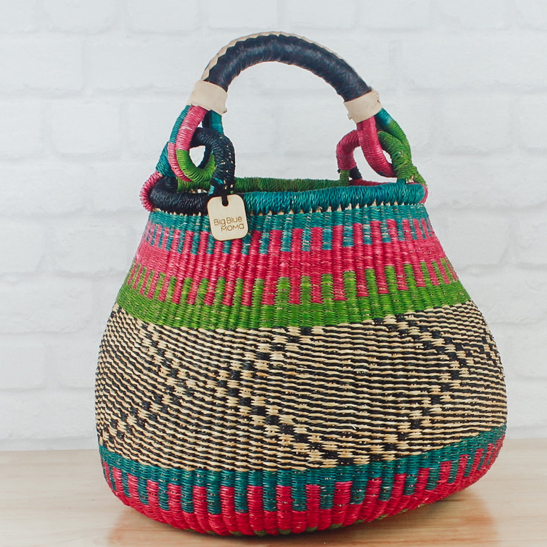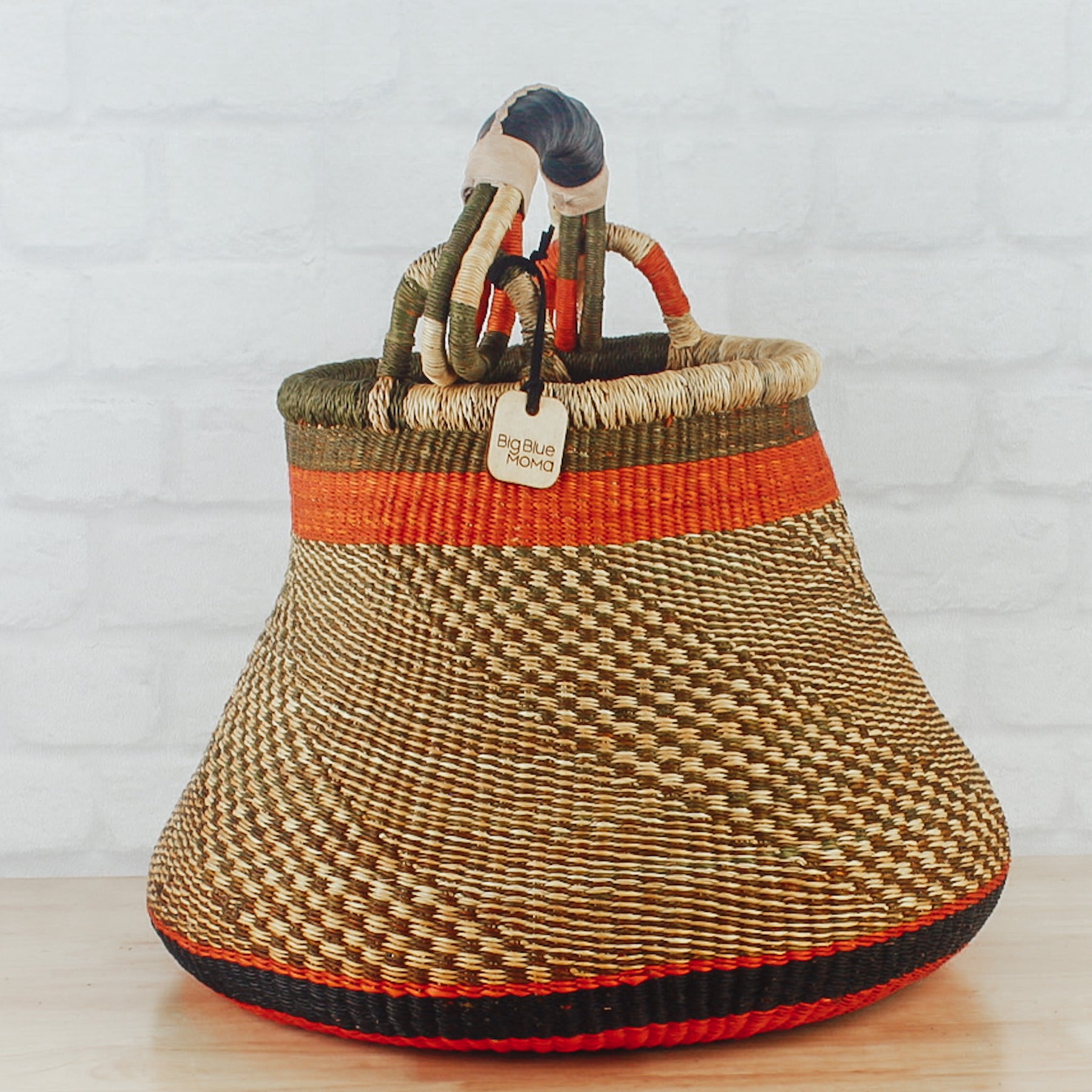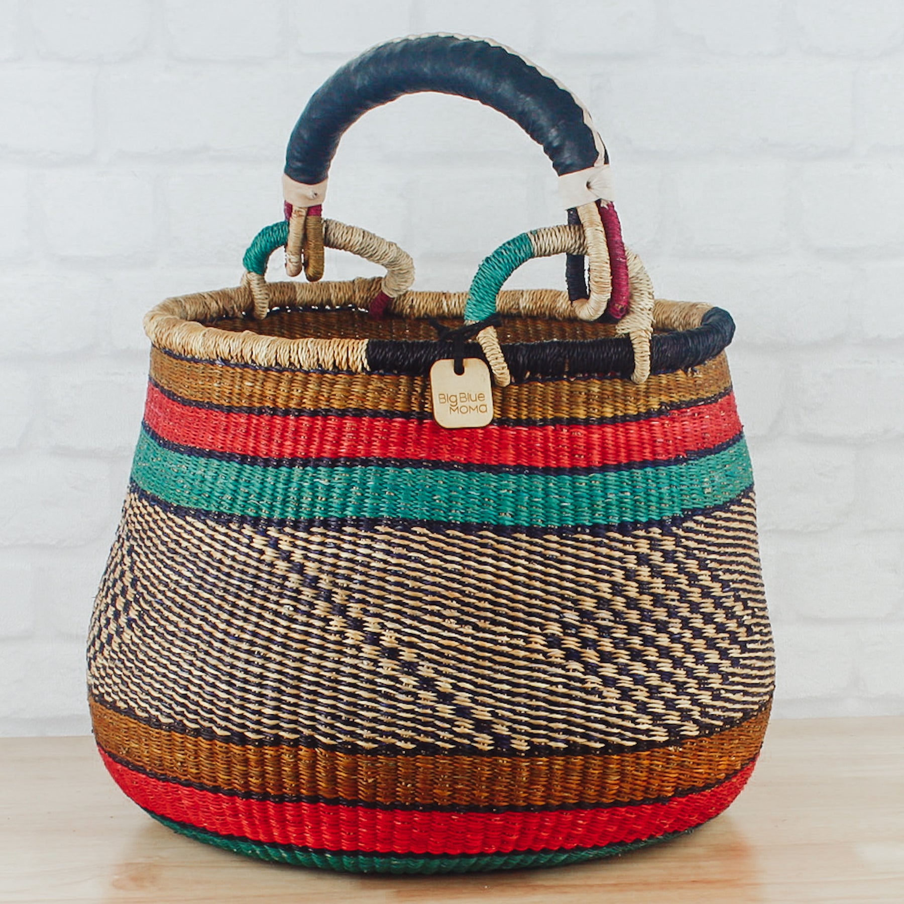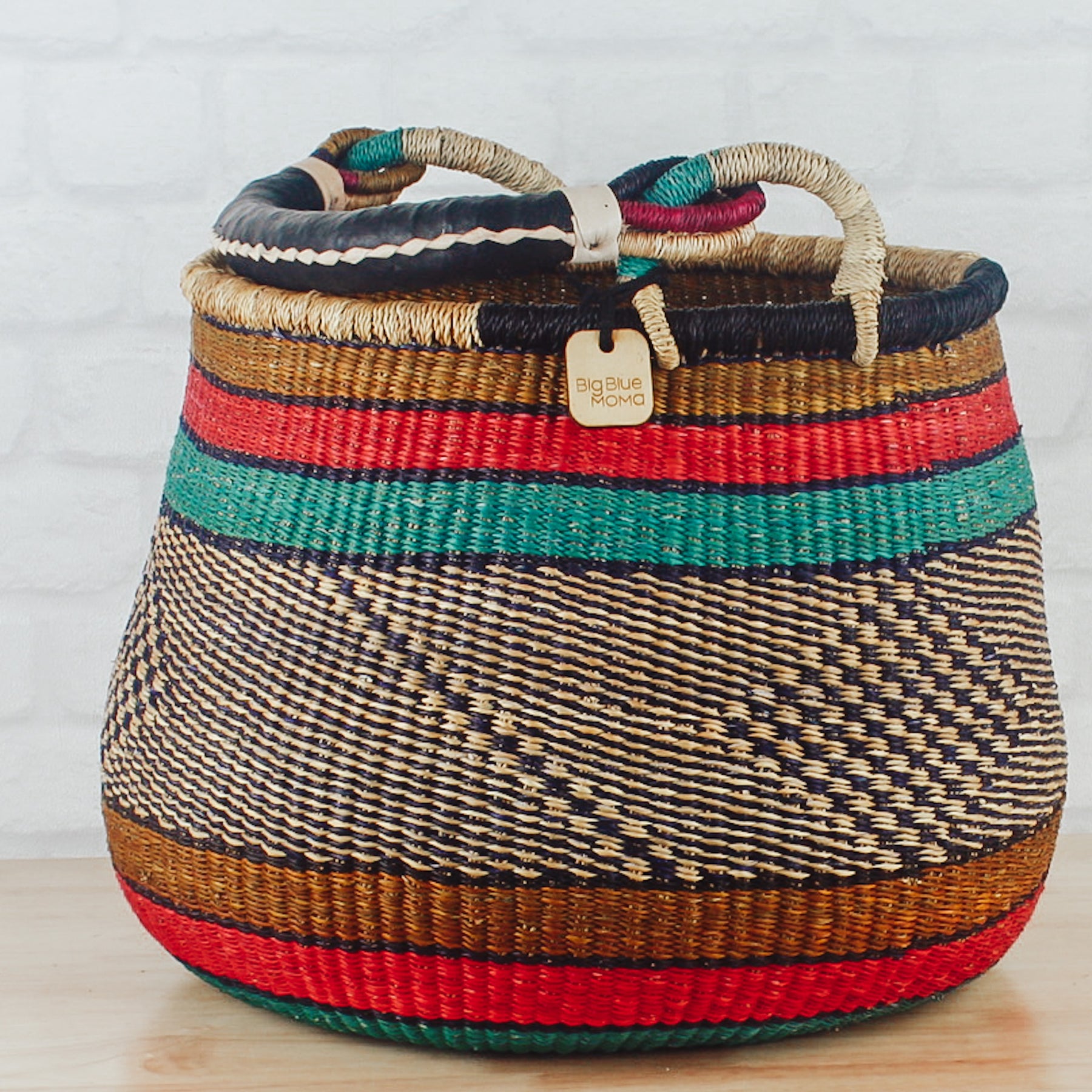This is the most traditional basket shape we carry. The Gambibgo is made by only the master weavers because of it's shape. It's single handle and narrow mouth make it great for laundry, picnics or collecting odds and ends around the house. The black and white handle is a signature of the collective we buy from and the way you can know your neighbours basket also came from Big Blue Moma!