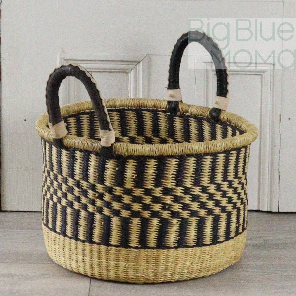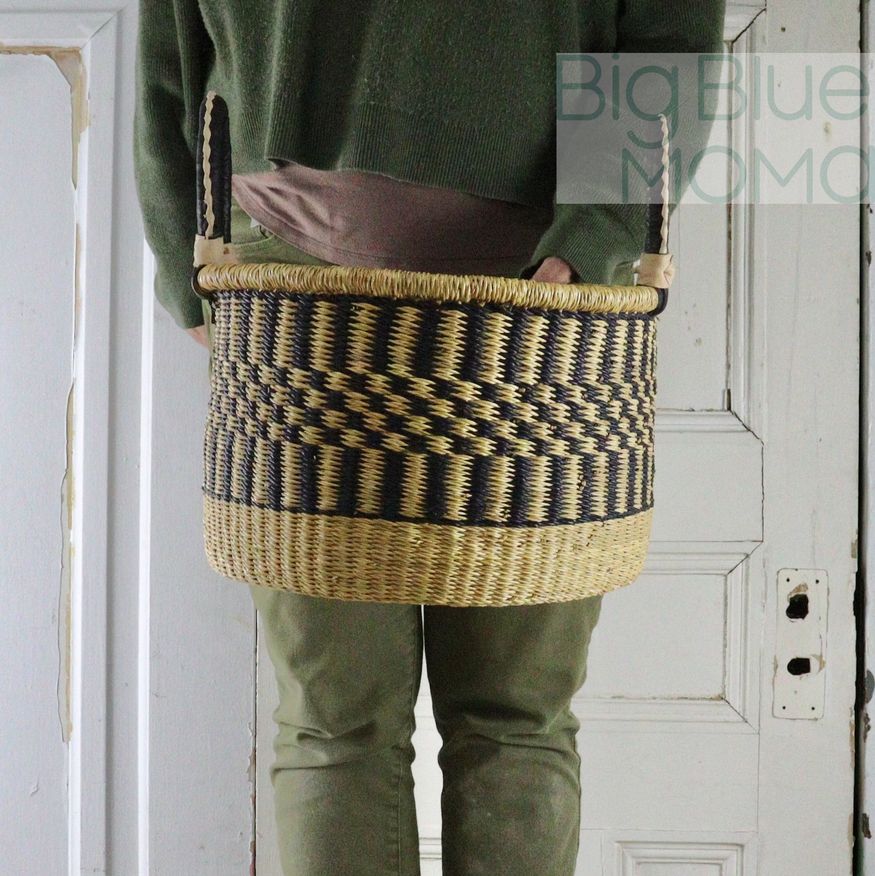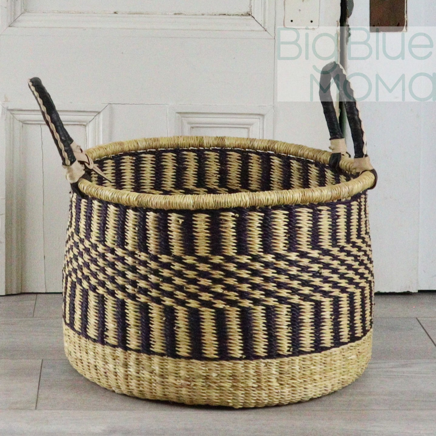 These handmade, hampers are practical for just about anything from laundry to dog toys to firewood. Sturdy construction and two handled design make it easy to carry large and heavy loads. All baskets are woven by hand with elephant grass indigenous to the Bolgatanga area of Ghana, West Africa. Handles are covered with goat leather reinforcing it's construction while also adding an extra level of comfort when carrying a full load.