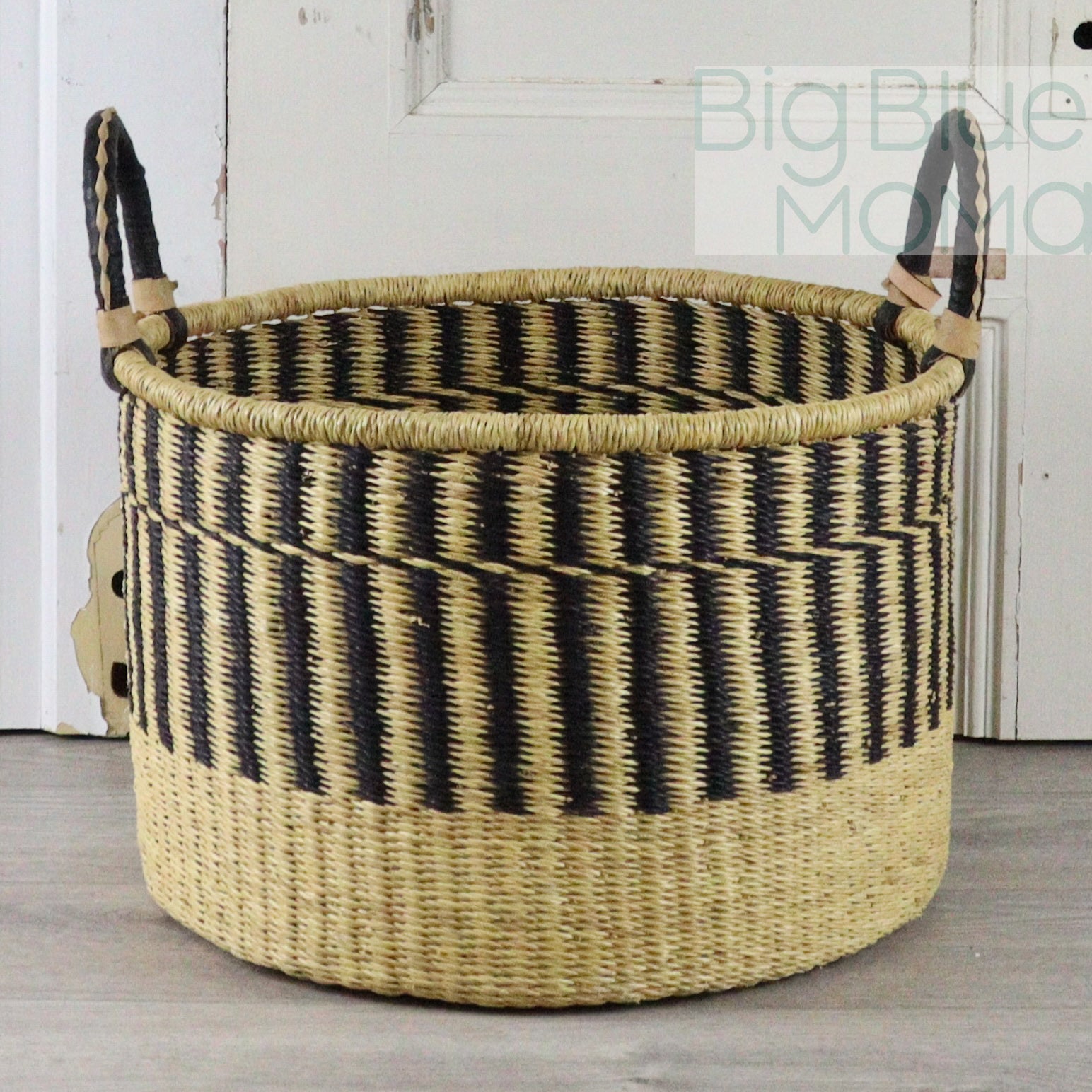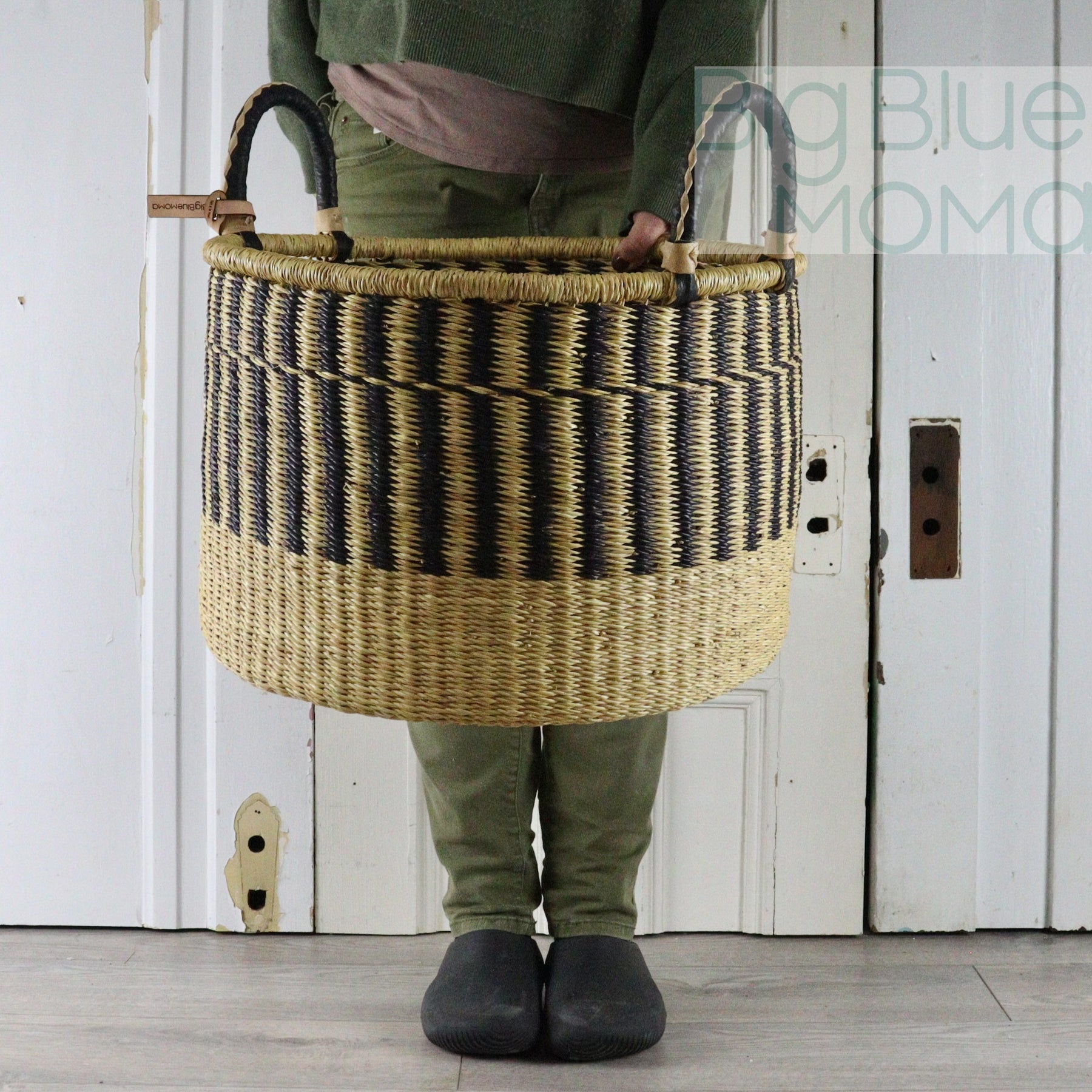 These handmade, hampers are practical for just about anything from laundry to dog toys to firewood. Sturdy construction and two handled design make it easy to carry large and heavy loads. All baskets are woven by hand with elephant grass indigenous to the Bolgatanga area of Ghana, West Africa. Handles are covered with goat leather reinforcing it's construction while also adding an extra level of comfort when carrying a full load.