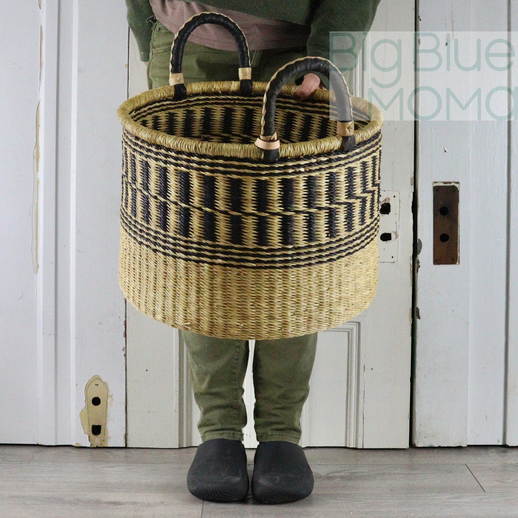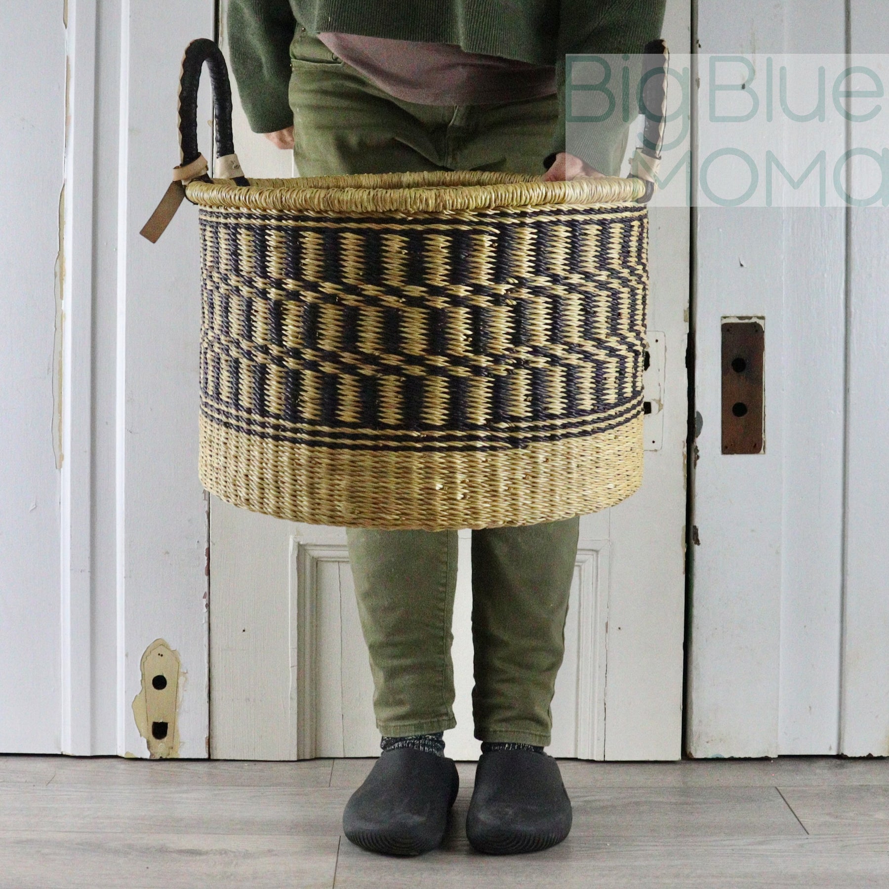 These handmade, hampers are practical for just about anything from laundry to dog toys to firewood. Sturdy construction and two handled design make it easy to carry large and heavy loads. All baskets are woven by hand with elephant grass indigenous to the Bolgatanga area of Ghana, West Africa. Handles are covered with goat leather reinforcing it's construction while also adding an extra level of comfort when carrying a full load.