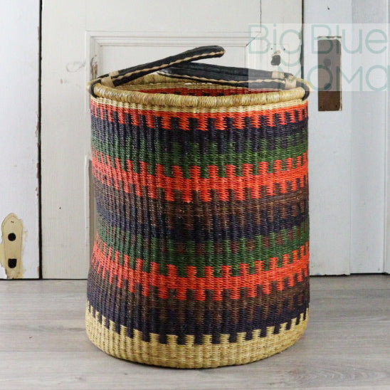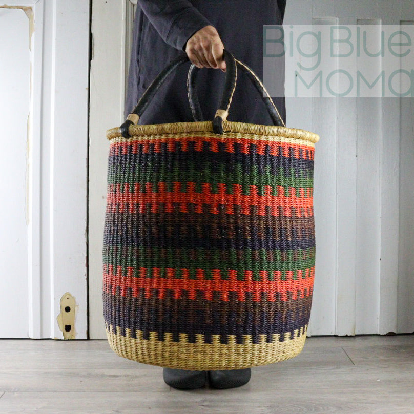 These handmade, hampers are practical for just about anything from laundry to dog toys to firewood. Sturdy construction and two handled design make it easy to carry large and heavy loads. All baskets are woven by hand with elephant grass indigenous to the Bolgatanga area of Ghana, West Africa. Handles are covered with goat leather reinforcing it's construction while also adding an extra level of comfort when carrying a full load.
