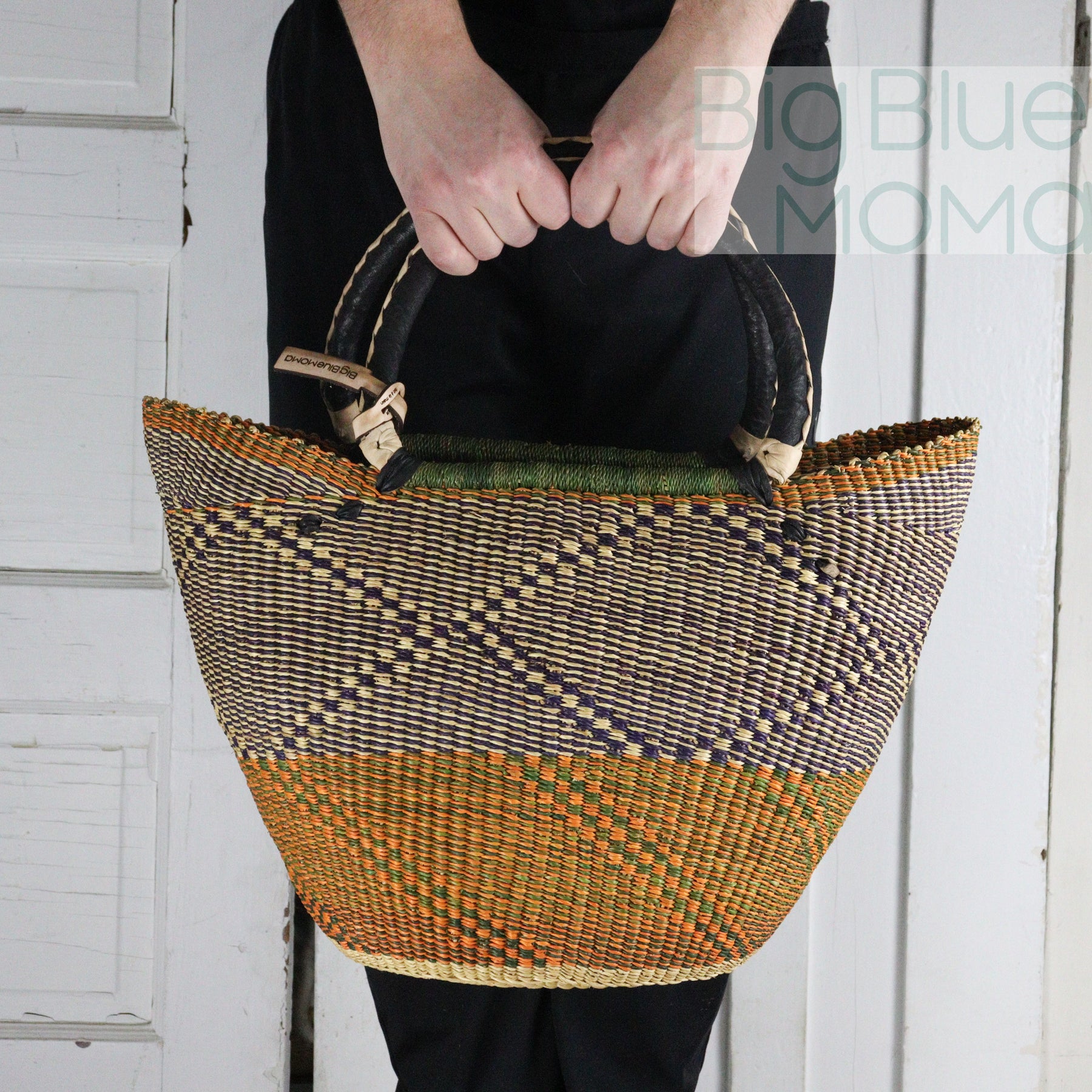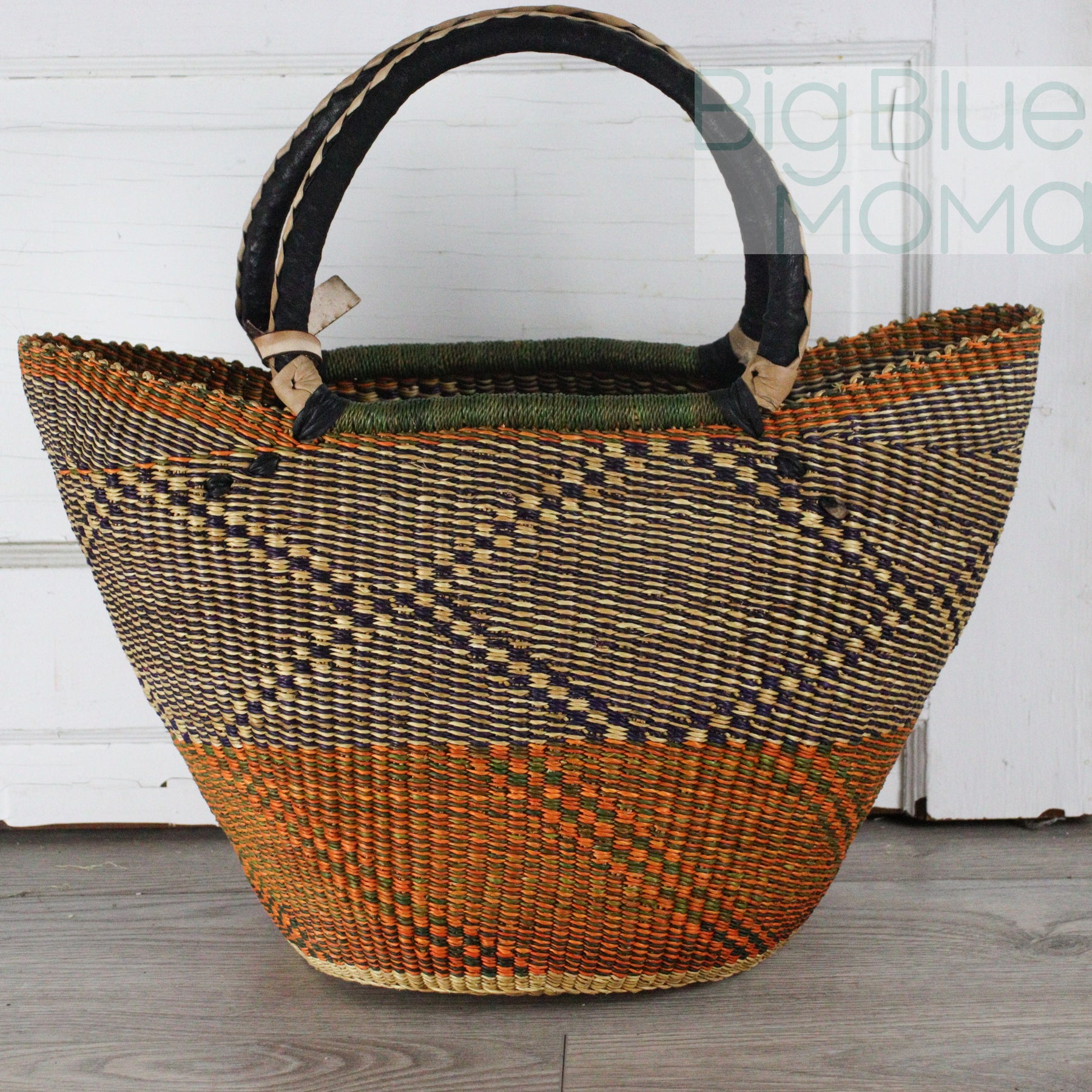 Bolga Basket Large U Shopper – Handwoven Market Basket – Orange & Black