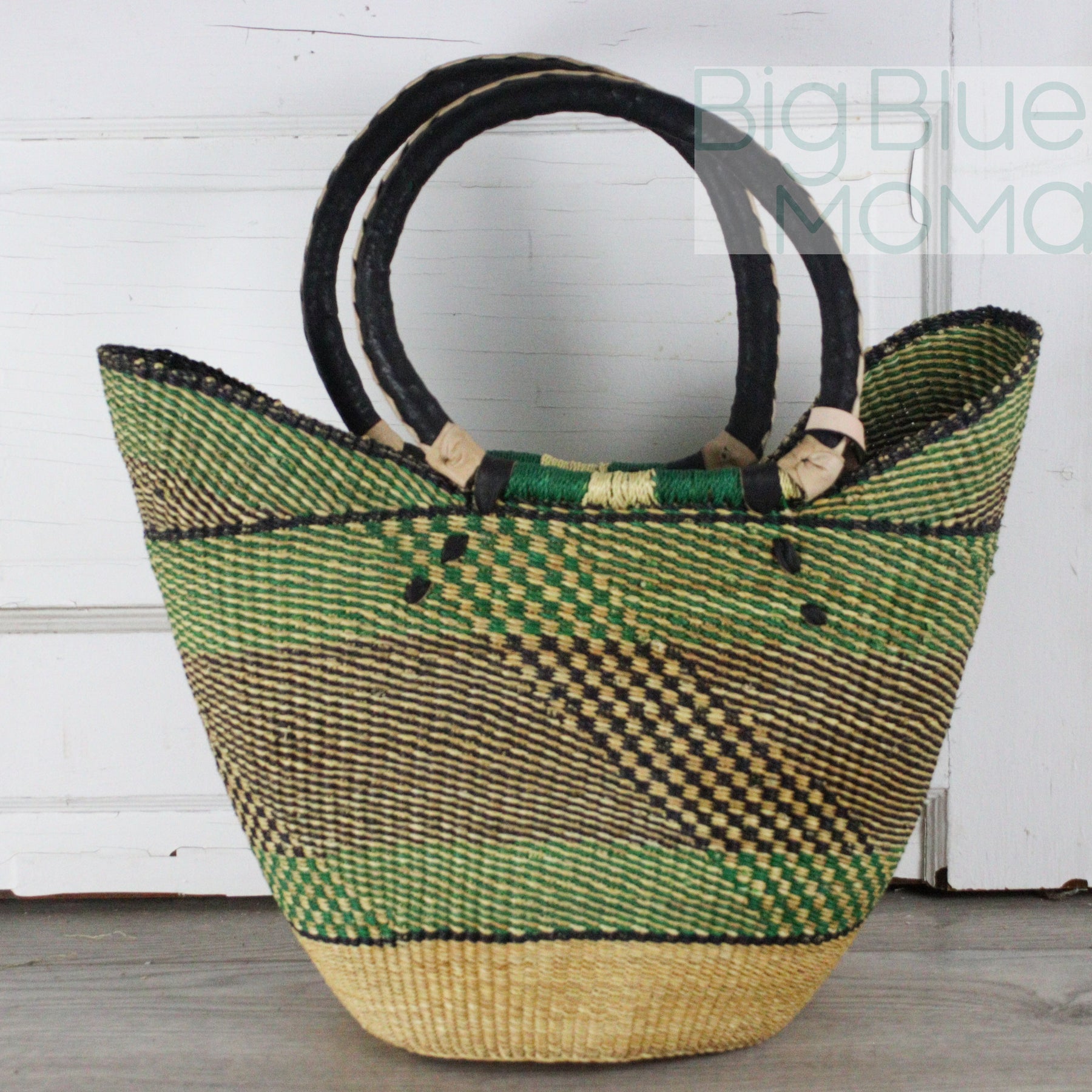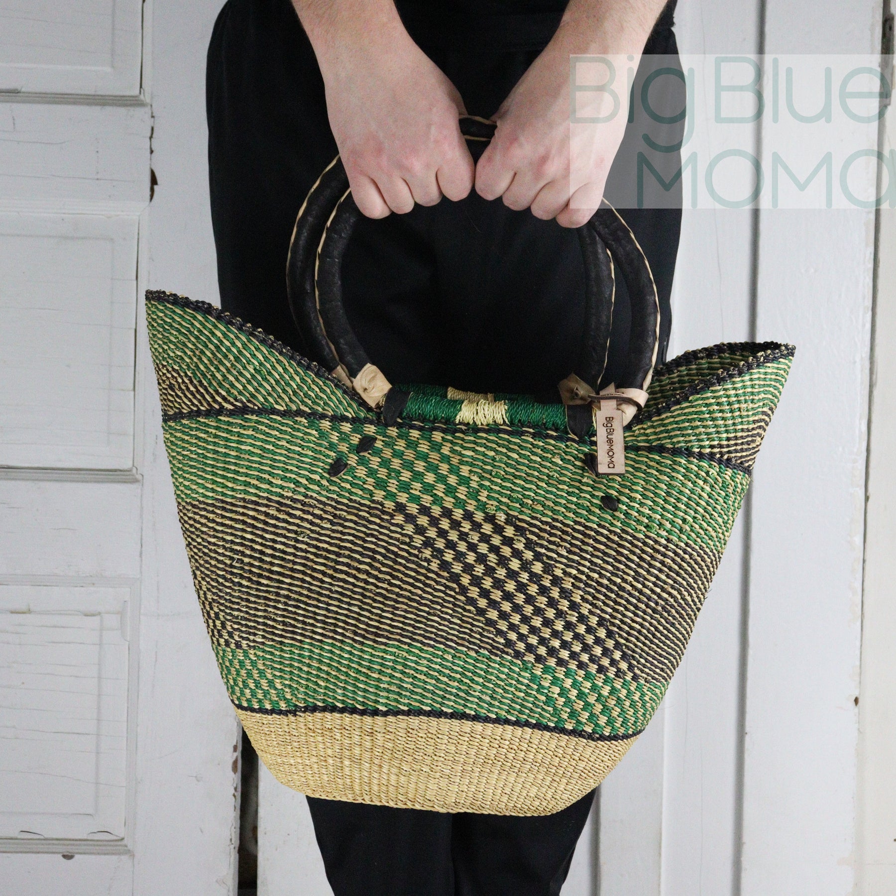 Bolga Basket Large U Shopper – Handwoven Market Basket – Green & Black Checks