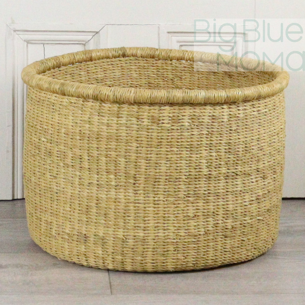 These handmade, hampers are practical for just about anything from laundry to dog toys to firewood. Sturdy construction and two handled design make it easy to carry large and heavy loads. All baskets are woven by hand with elephant grass indigenous to the Bolgatanga area of Ghana, West Africa. Handles are covered with goat leather reinforcing it's construction while also adding an extra level of comfort when carrying a full load.