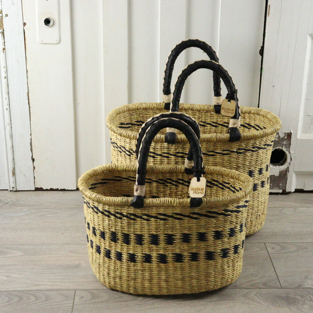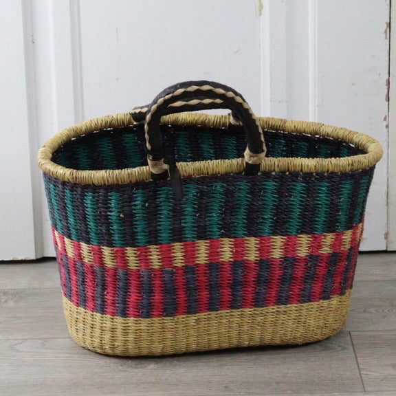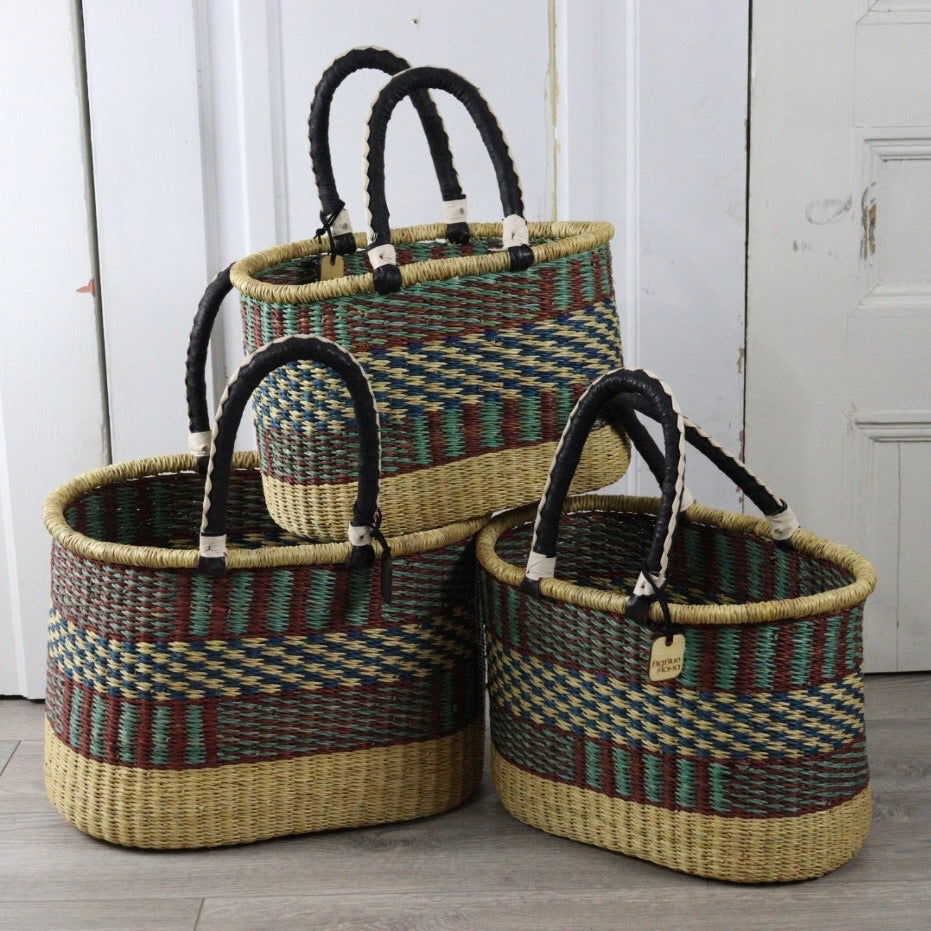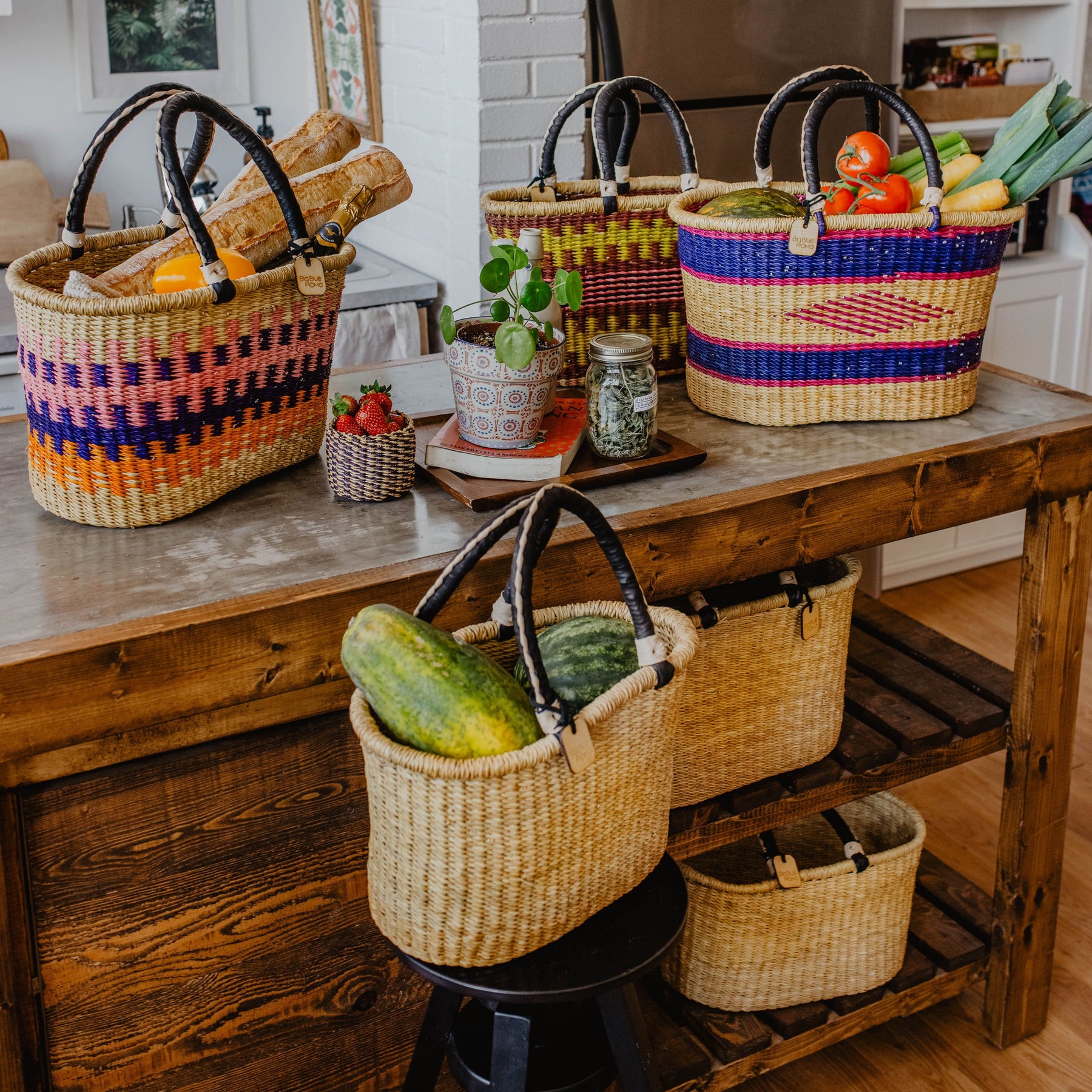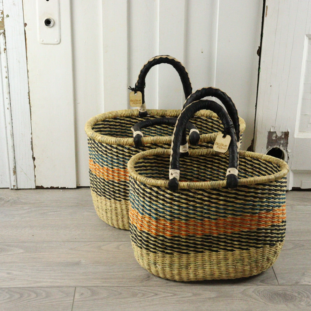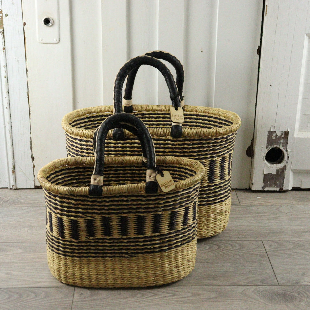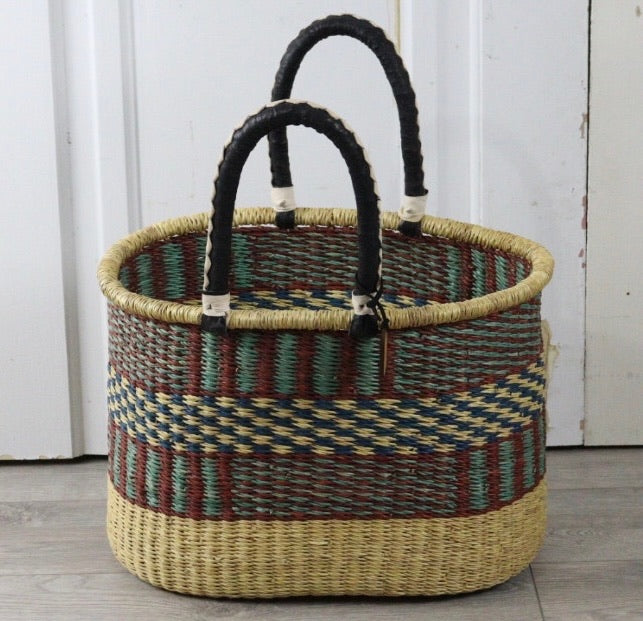Oval Baskets come in three different sizes and when shipped from Ghana, they are nested. The Large is approximately 17" x 12" x 10", the Medium is 15" x 10" x 9" and the small is 14" x 8.5" x 9". Ovals are great for carrying jars, bottles and anything that has to remain upright.