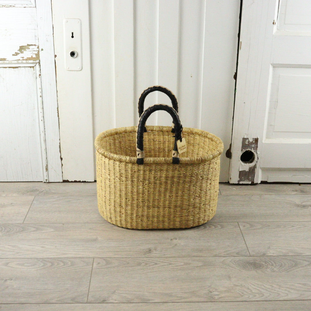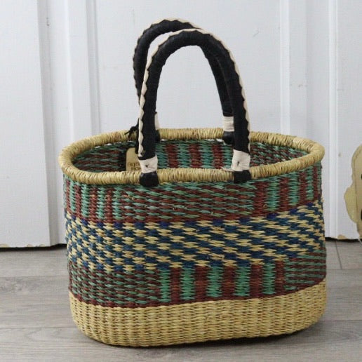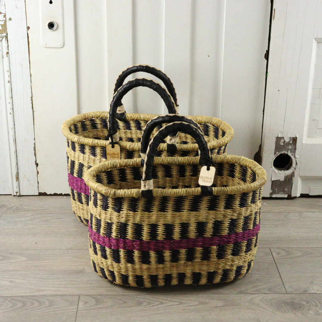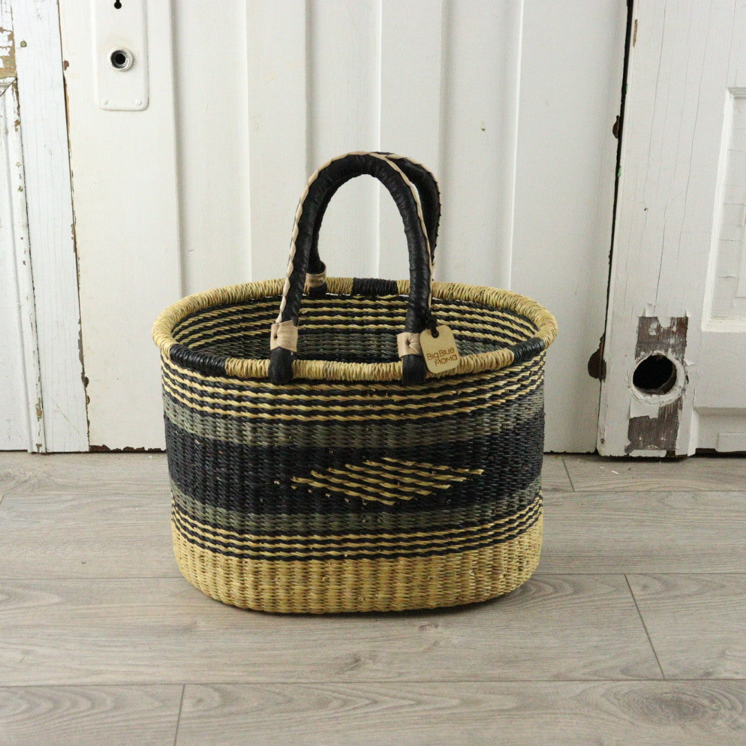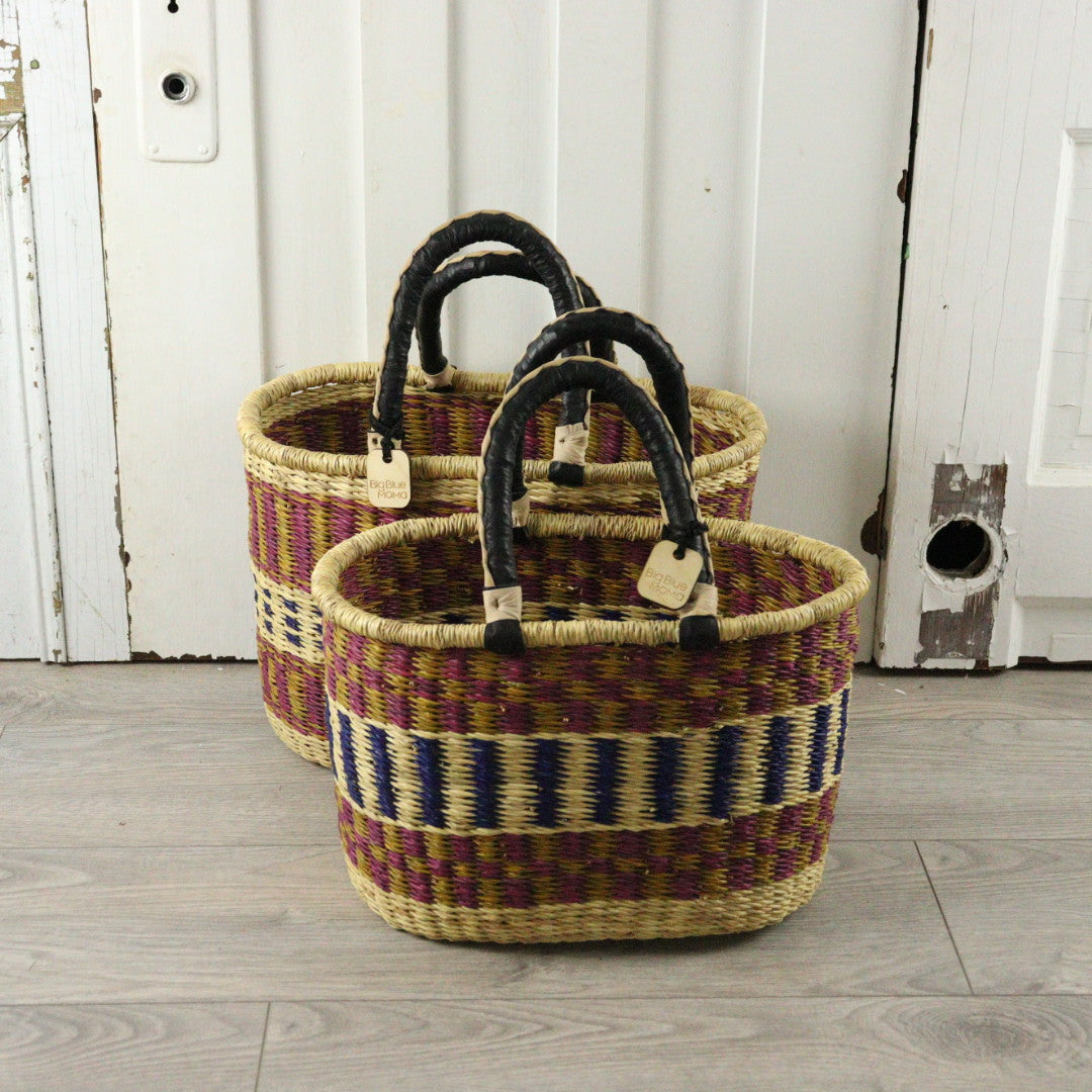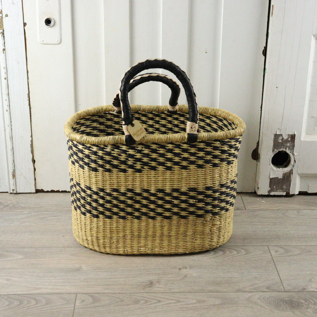 Oval Baskets come in three different sizes and when shipped from Ghana, they are nested. The Large is approximately 17" x 12" x 10", the Medium is 15" x 10" x 9" and the small is 14" x 8.5" x 9". Ovals are great for carrying jars, bottles and anything that has to remain upright.