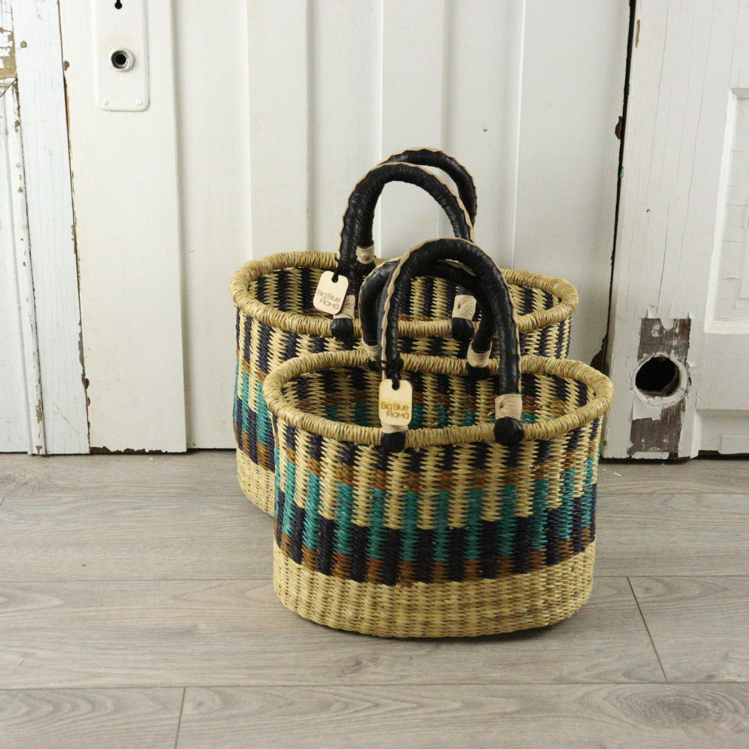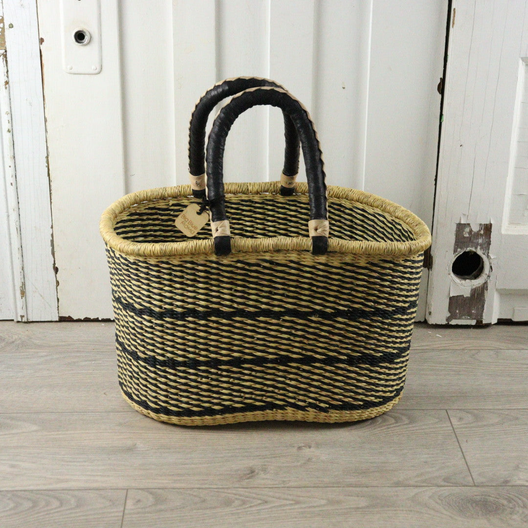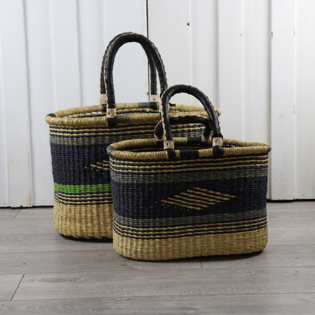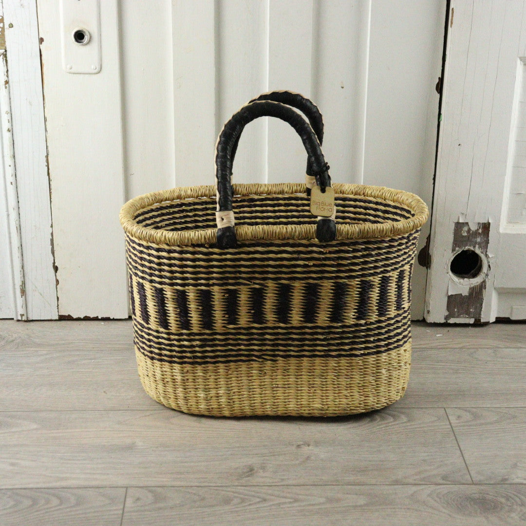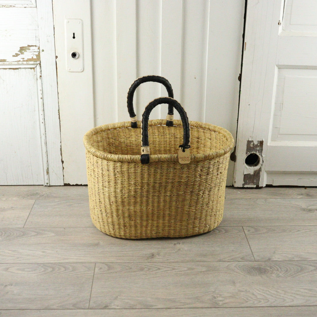 Oval Baskets come in three different sizes and when shipped from Ghana, they are nested. The Large is approximately 17" x 12" x 10", the Medium is 15" x 10" x 9" and the small is 14" x 8.5" x 9". Ovals are great for carrying jars, bottles and anything that has to remain upright.