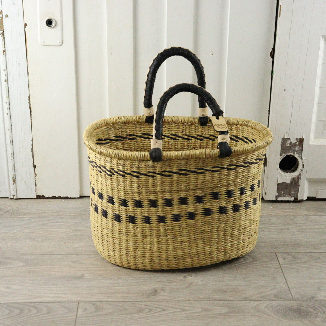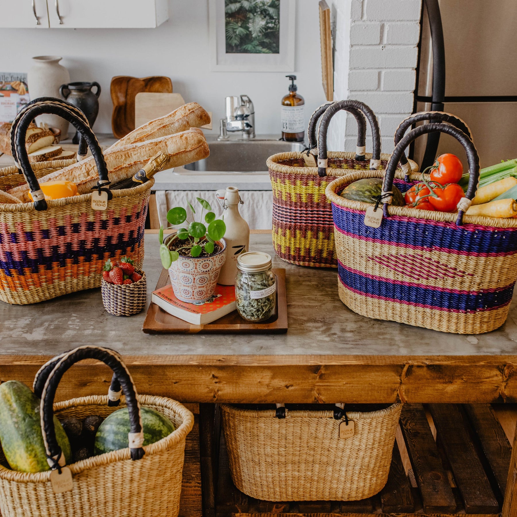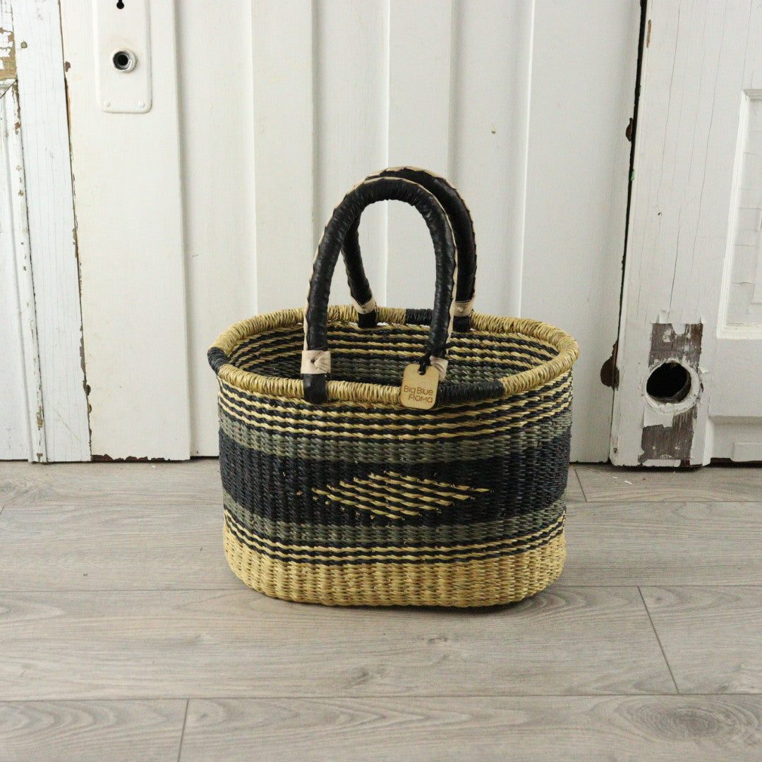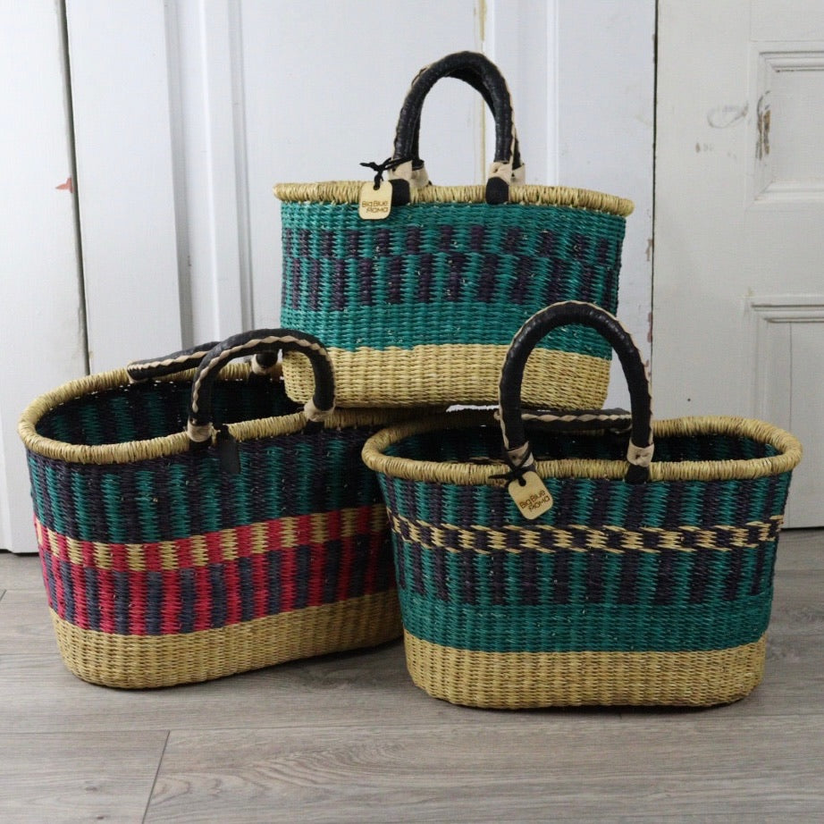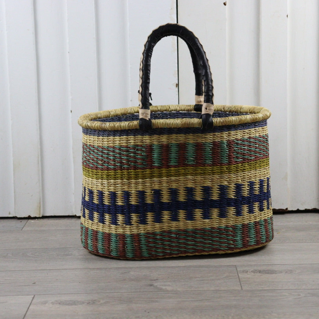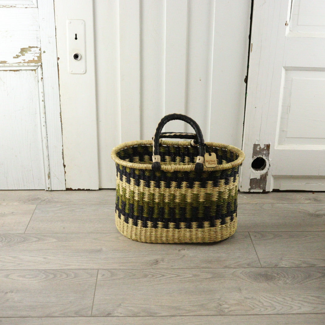 Oval Baskets come in three different sizes and when shipped from Ghana, they are nested. The Large is approximately 17" x 12" x 10", the Medium is 15" x 10" x 9" and the small is 14" x 8.5" x 9". Ovals are great for carrying jars, bottles and anything that has to remain upright.