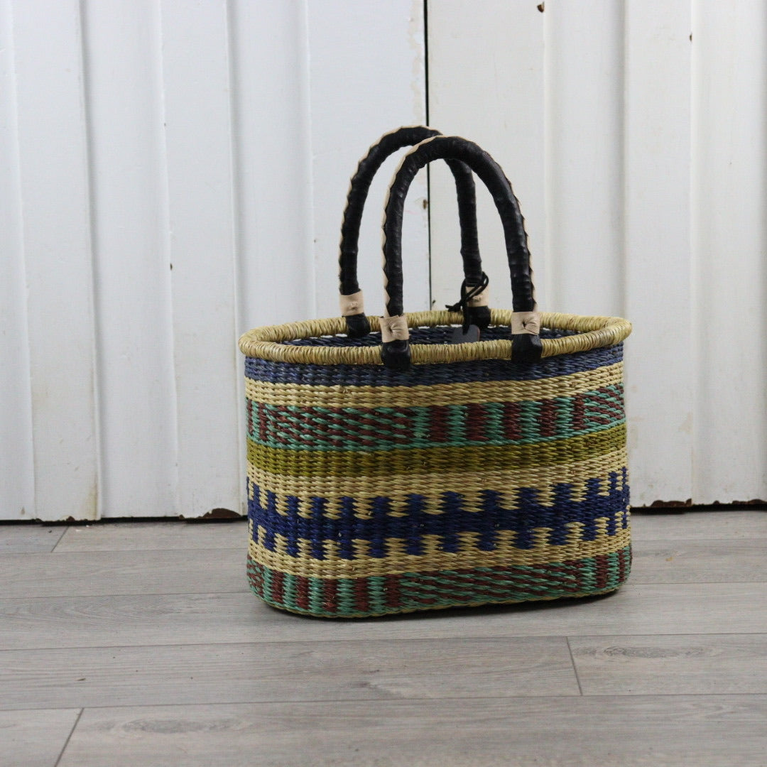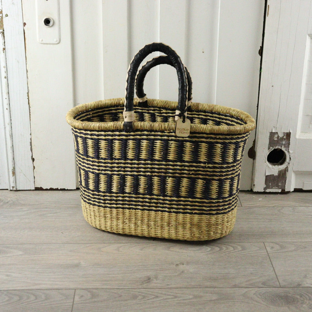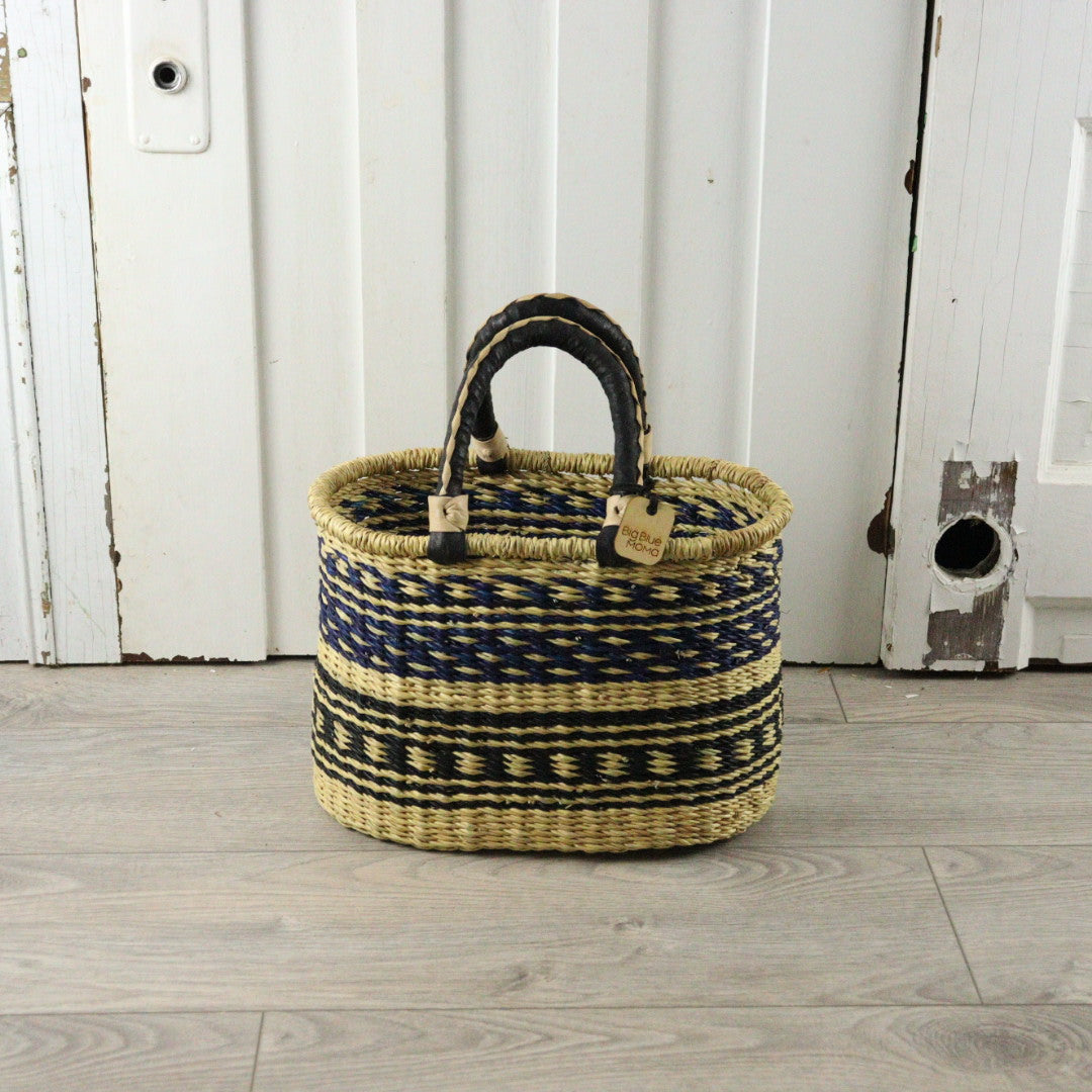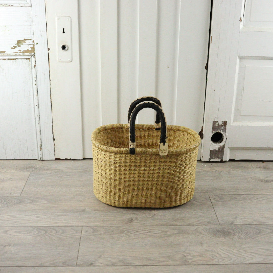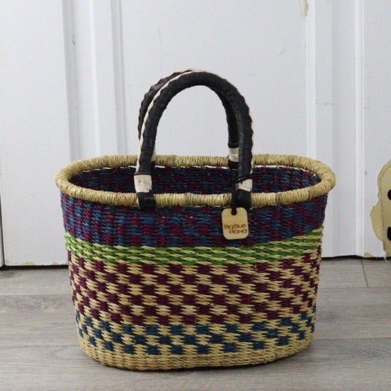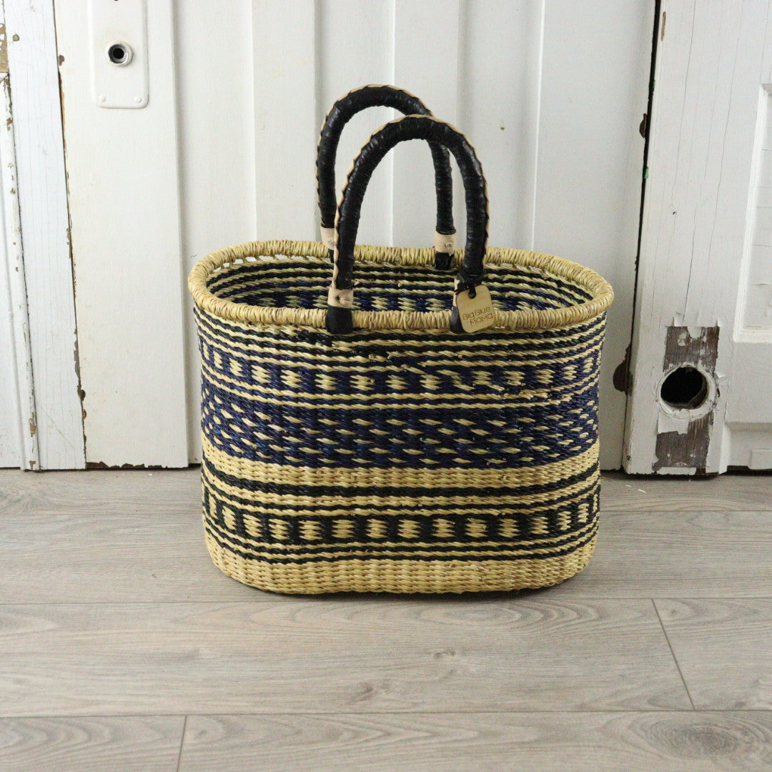 Oval Baskets come in three different sizes and when shipped from Ghana, they are nested. The Large is approximately 17" x 12" x 10", the Medium is 15" x 10" x 9" and the small is 14" x 8.5" x 9". Ovals are great for carrying jars, bottles and anything that has to remain upright.