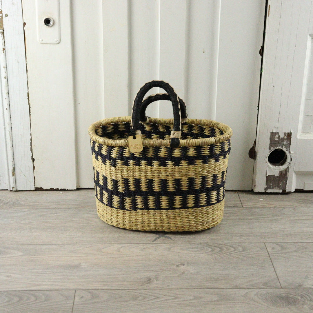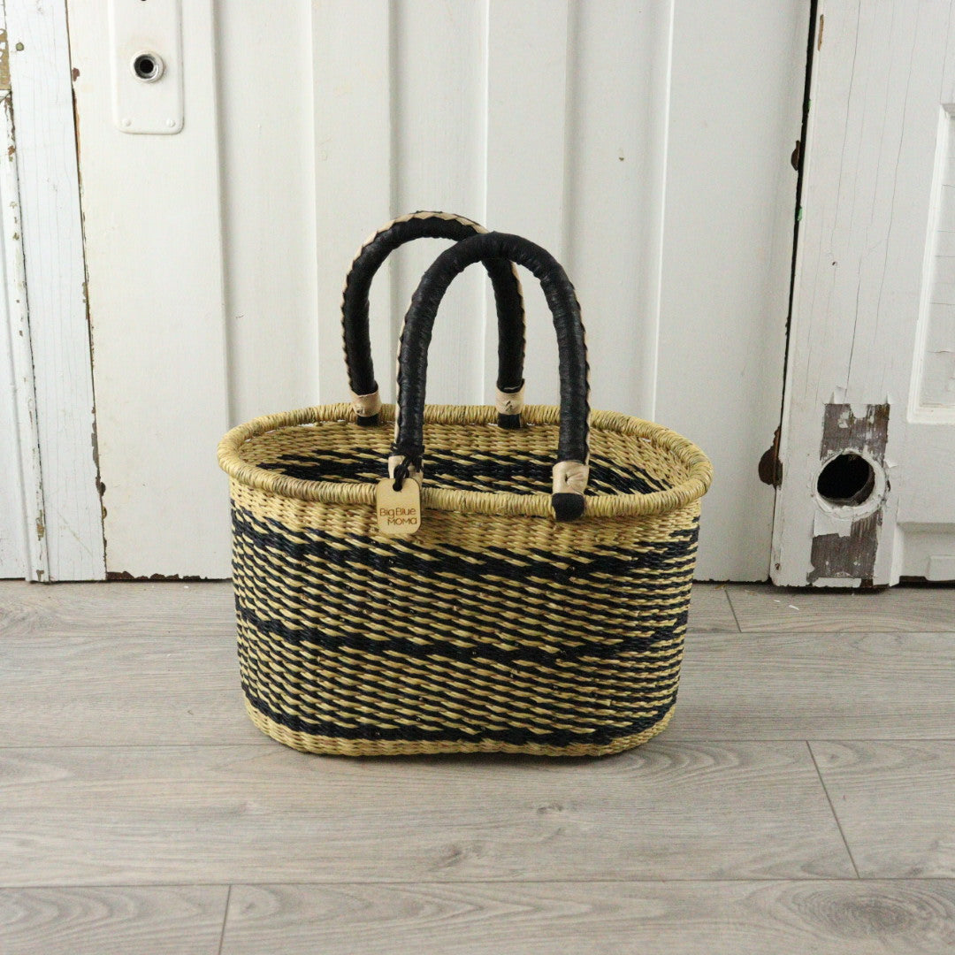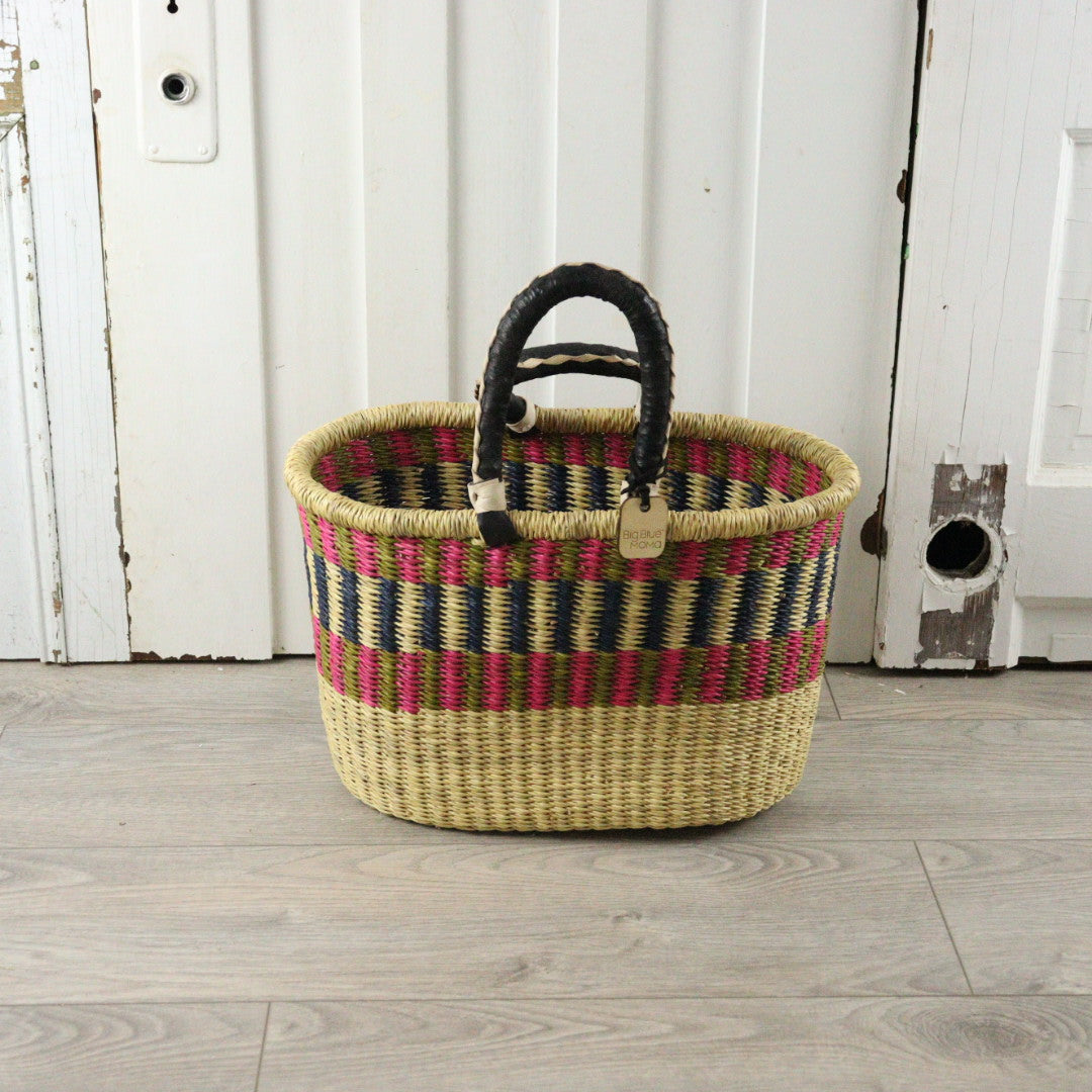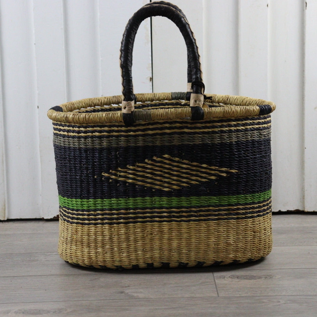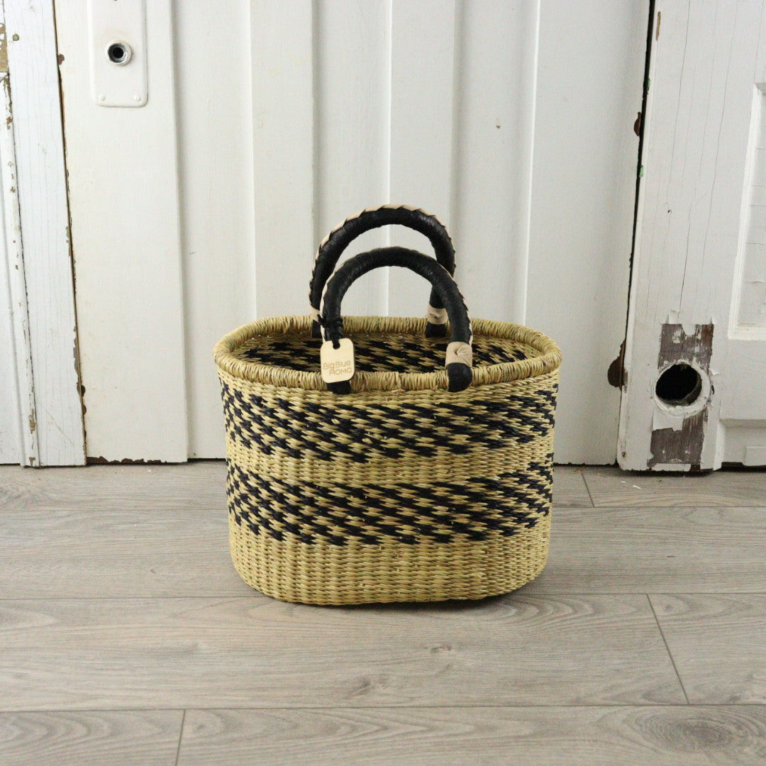 Oval Baskets come in three different sizes and when shipped from Ghana, they are nested. The Large is approximately 17" x 12" x 10", the Medium is 15" x 10" x 9" and the small is 14" x 8.5" x 9". Ovals are great for carrying jars, bottles and anything that has to remain upright.