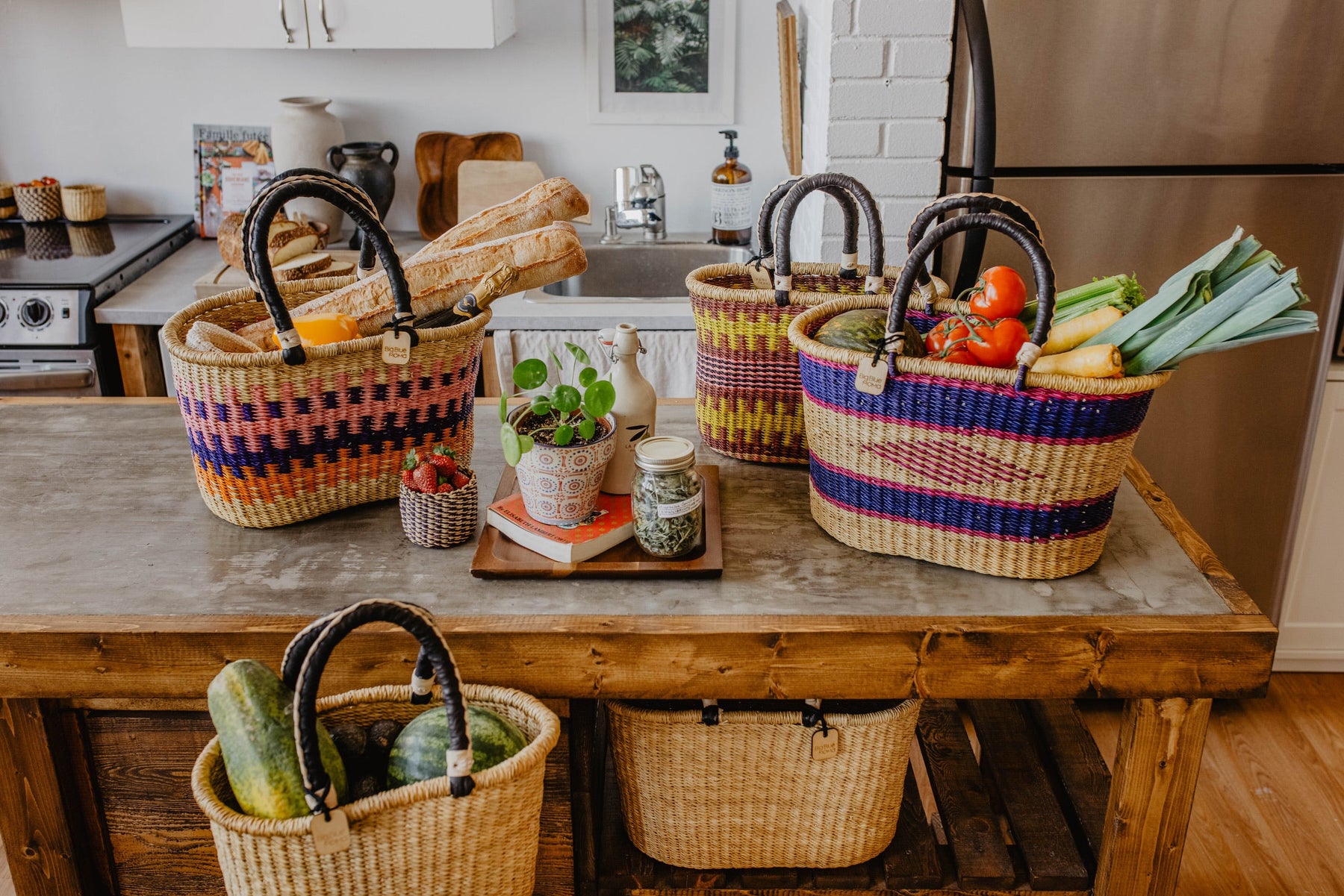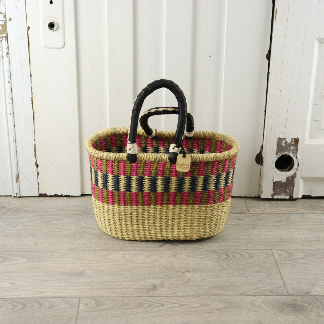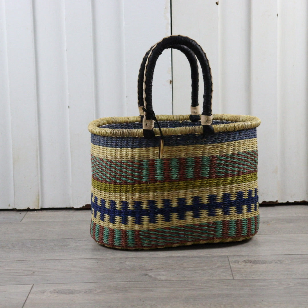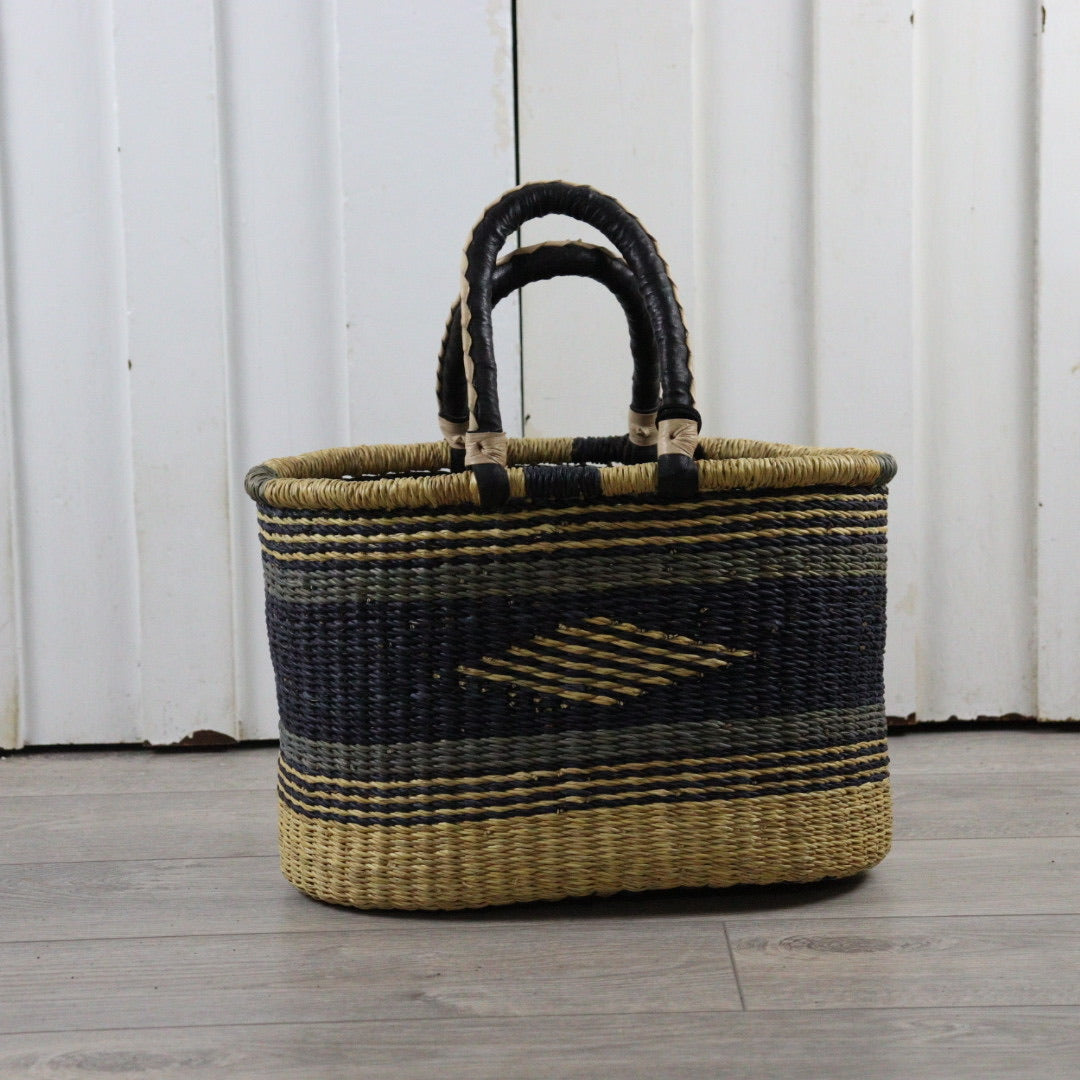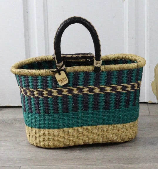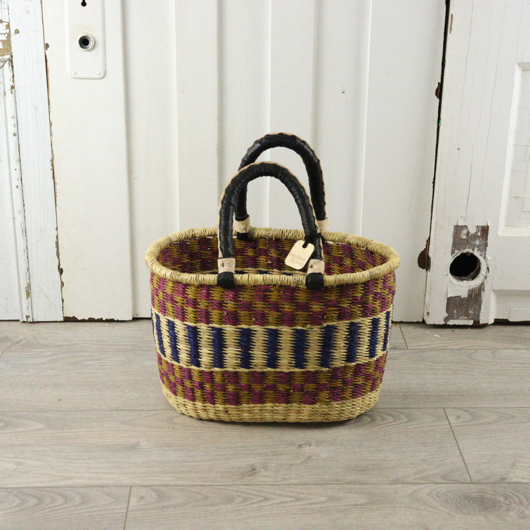 Oval Baskets come in three different sizes and when shipped from Ghana, they are nested. The Large is approximately 17" x 12" x 10", the Medium is 15" x 10" x 9" and the small is 14" x 8.5" x 9". Ovals are great for carrying jars, bottles and anything that has to remain upright.