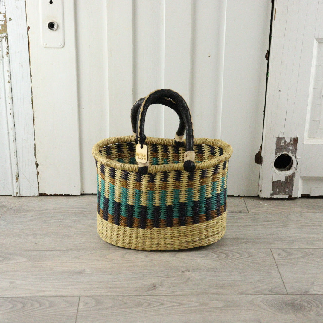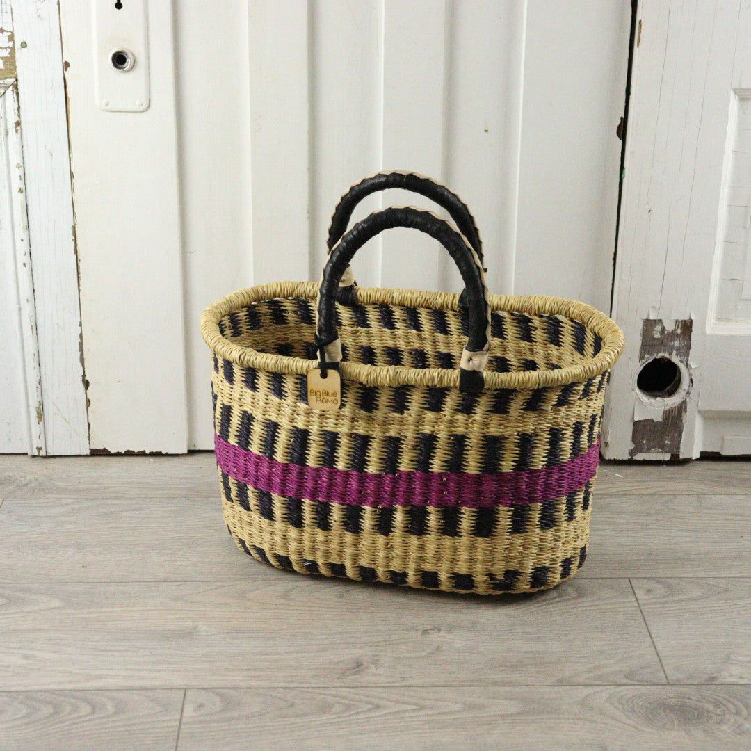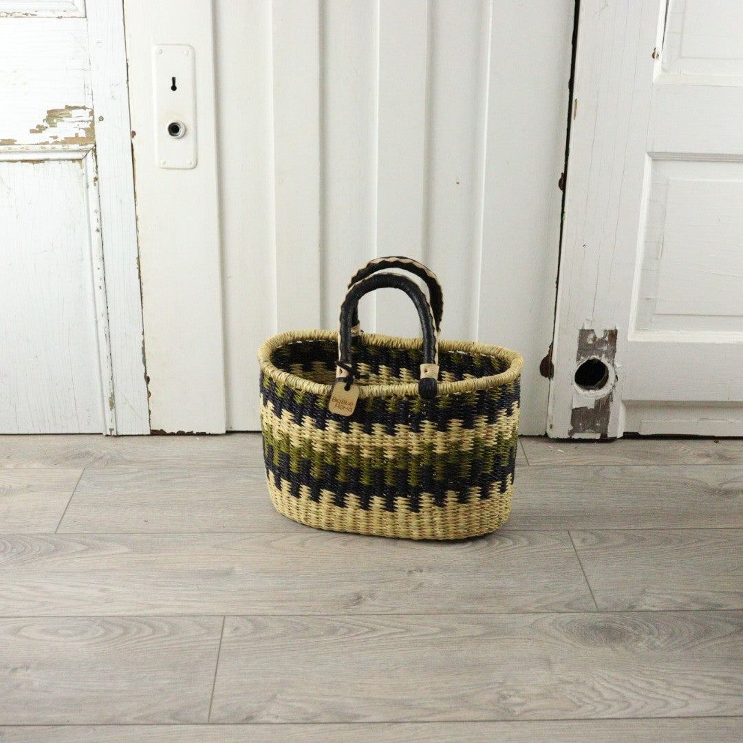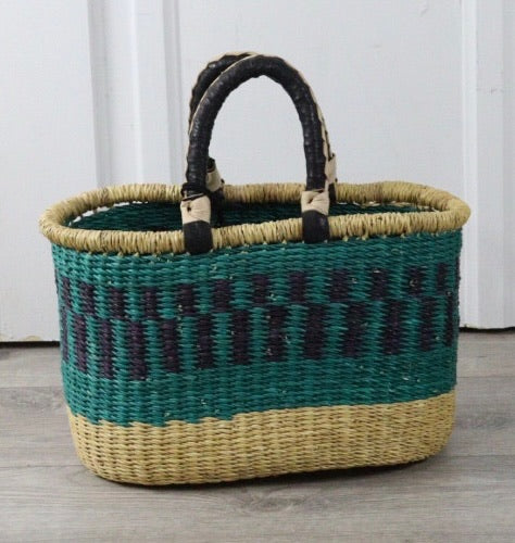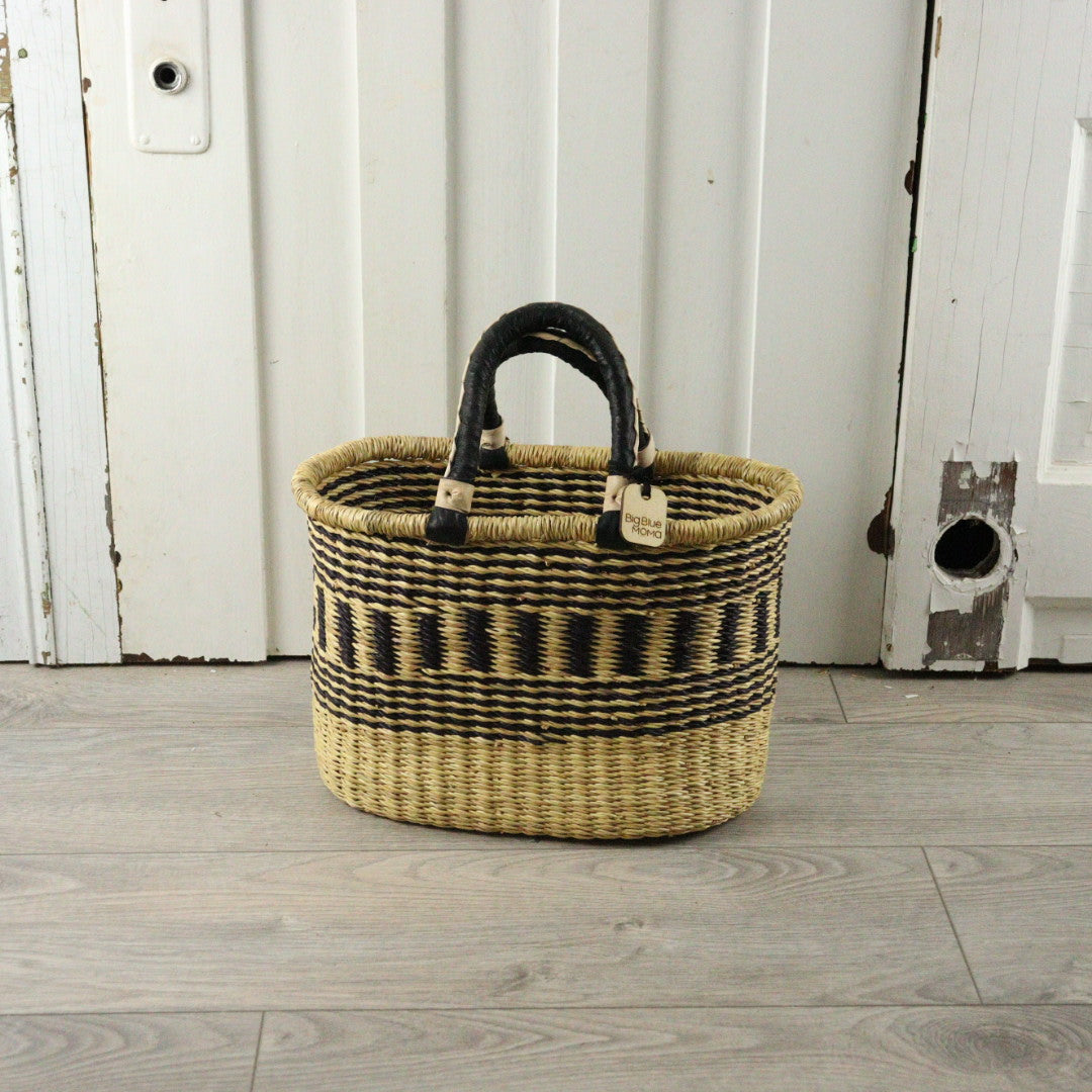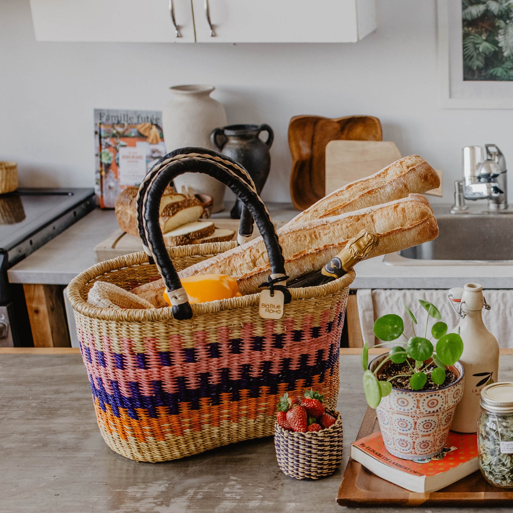 Oval Baskets come in three different sizes and when shipped from Ghana, they are nested. The Large is approximately 17" x 12" x 10", the Medium is 15" x 10" x 9" and the small is 14" x 8.5" x 9". Ovals are great for carrying jars, bottles and anything that has to remain upright.