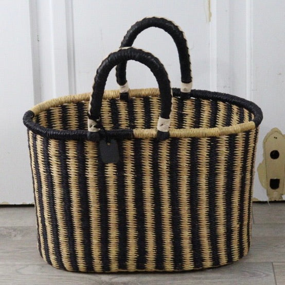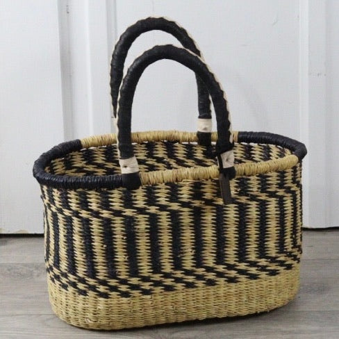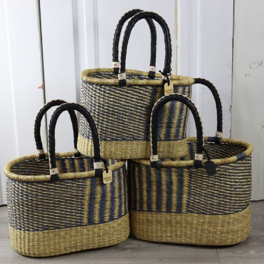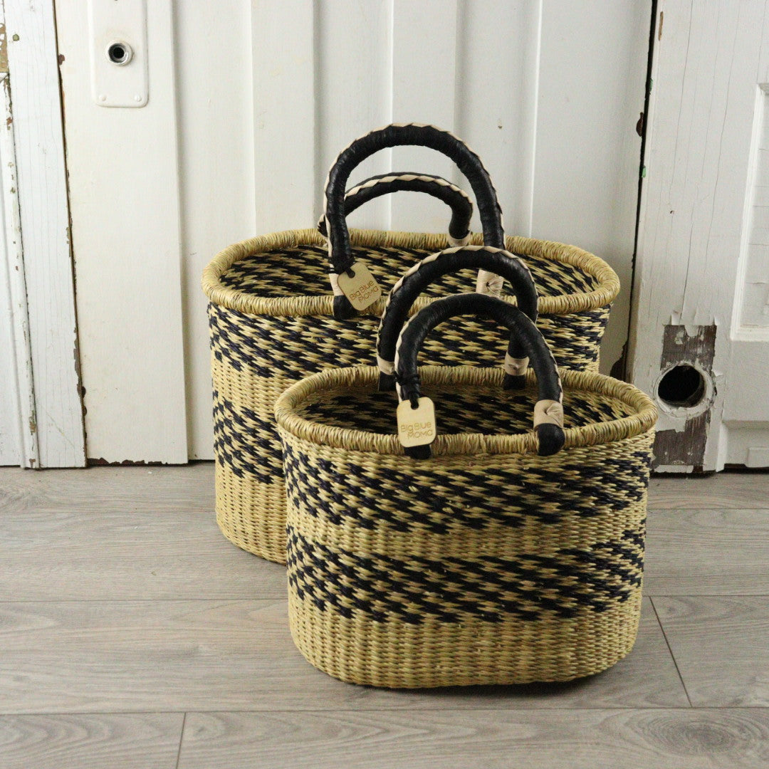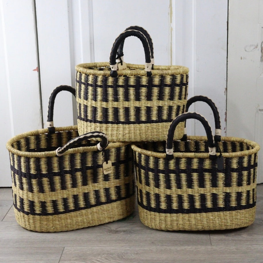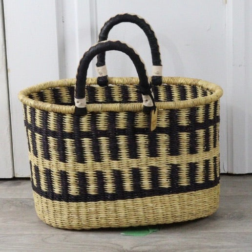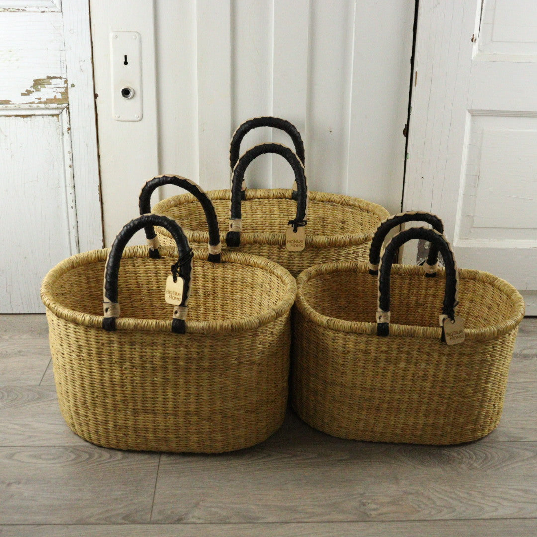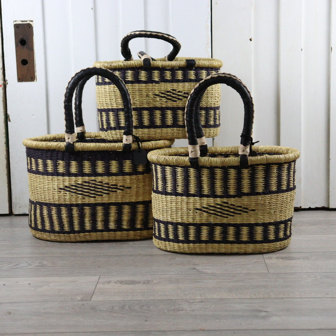Oval Baskets come in three different sizes and when shipped from Ghana, they are nested. The Large is approximately 17" x 12" x 10", the Medium is 15" x 10" x 9" and the small is 14" x 8.5" x 9". Ovals are great for carrying jars, bottles and anything that has to remain upright.