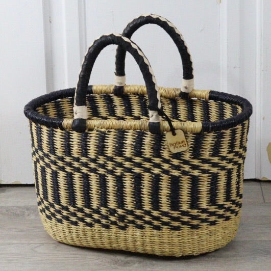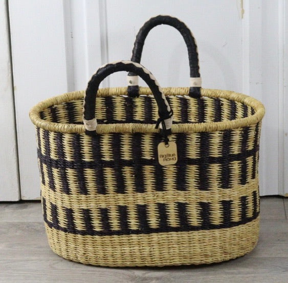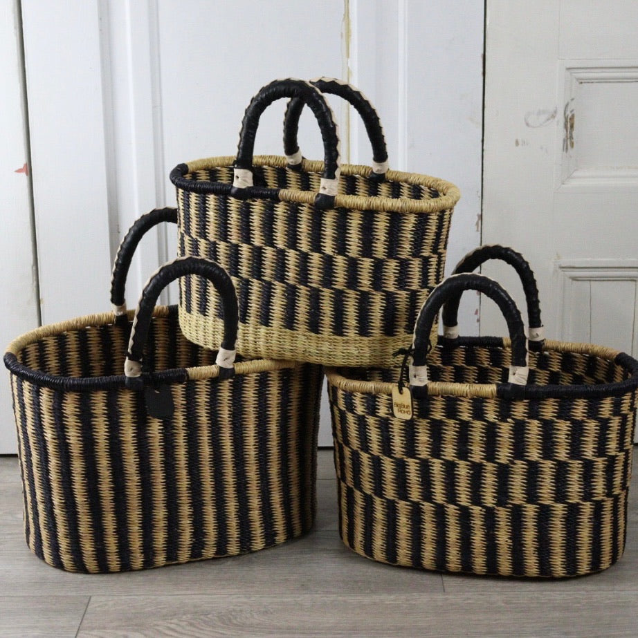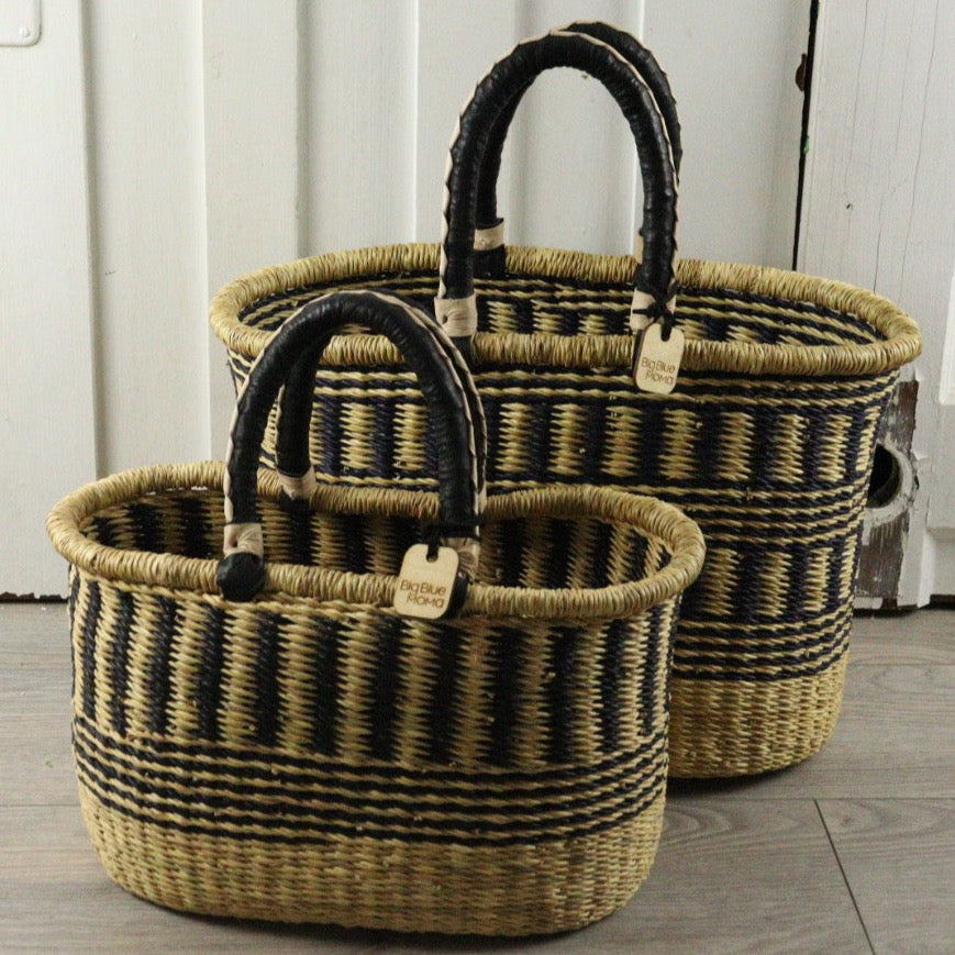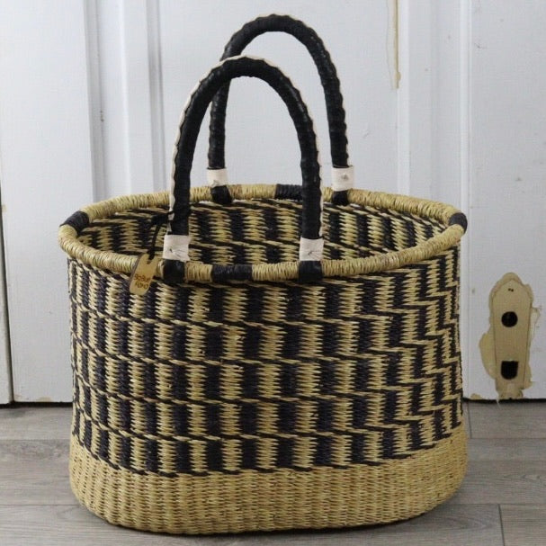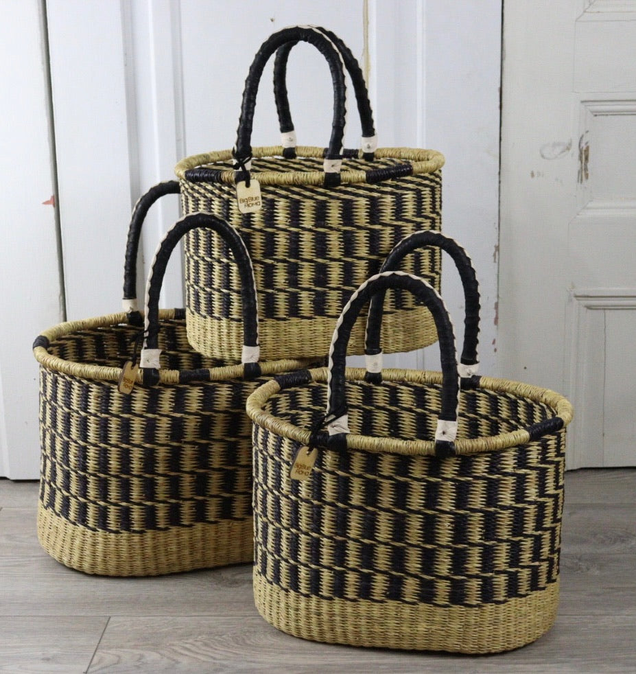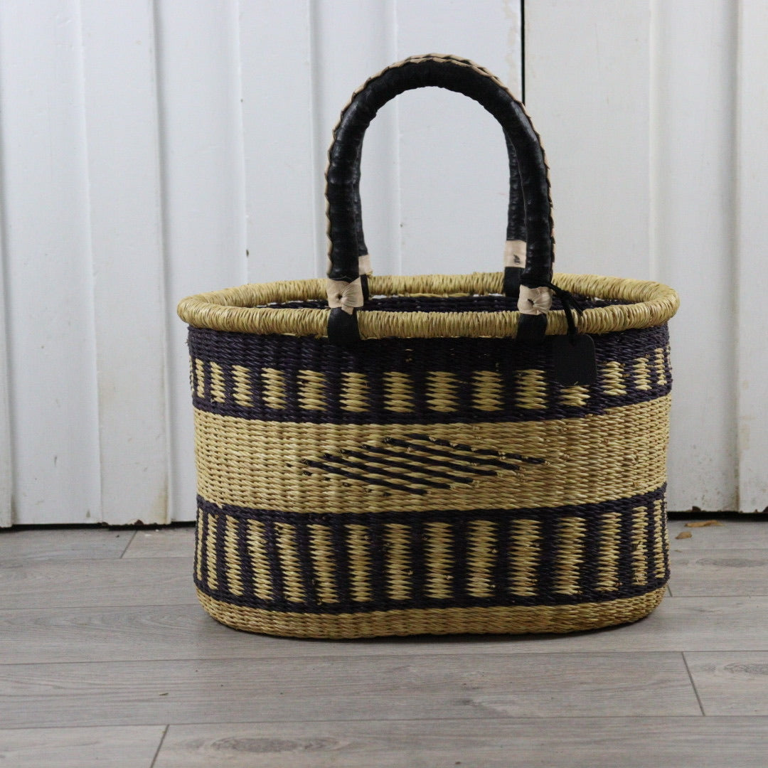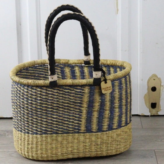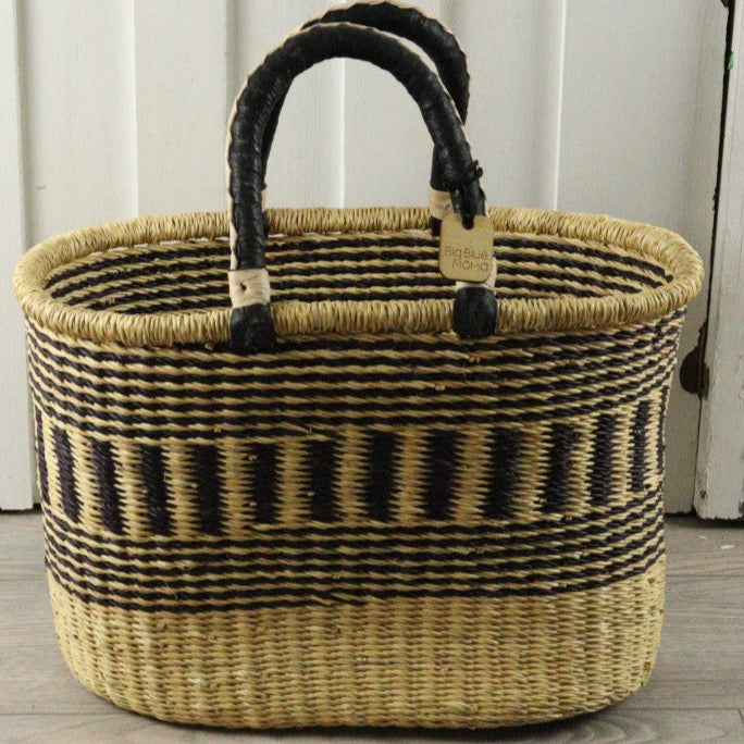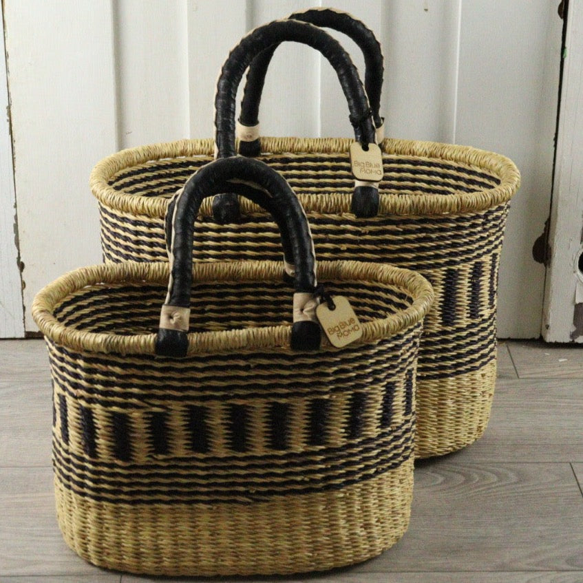 Oval Baskets come in three different sizes and when shipped from Ghana, they are nested. The Large is approximately 17" x 12" x 10", the Medium is 15" x 10" x 9" and the small is 14" x 8.5" x 9". Ovals are great for carrying jars, bottles and anything that has to remain upright.