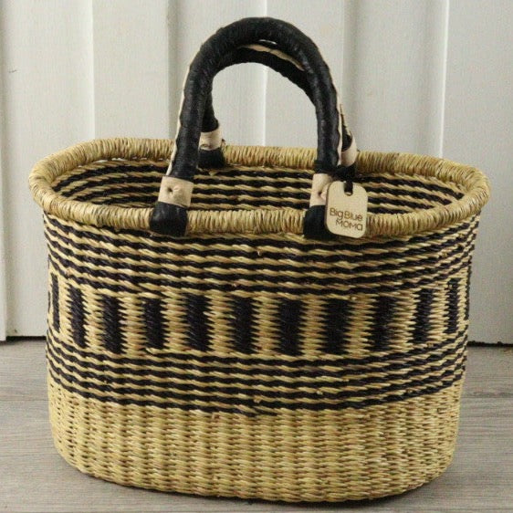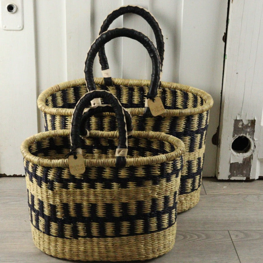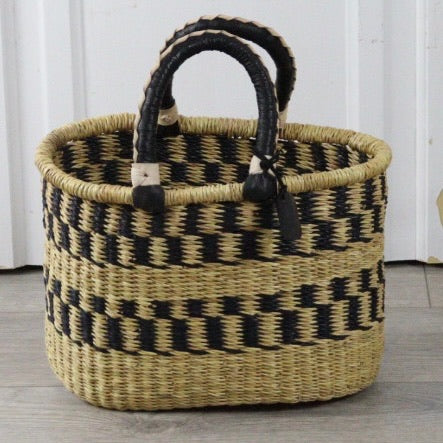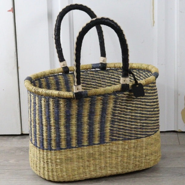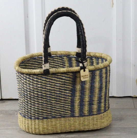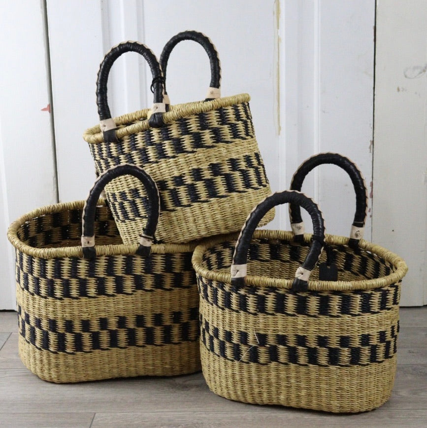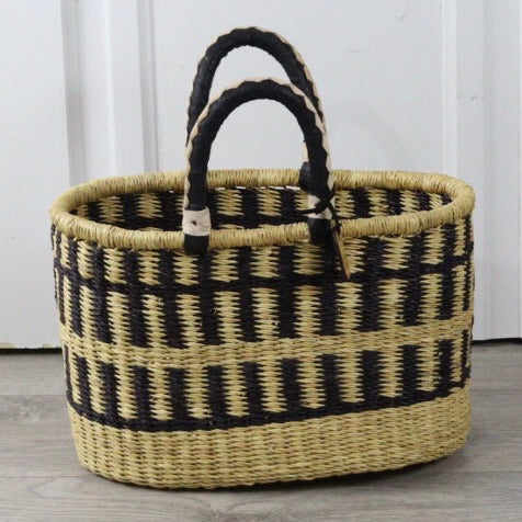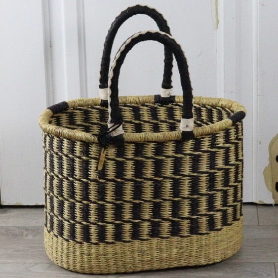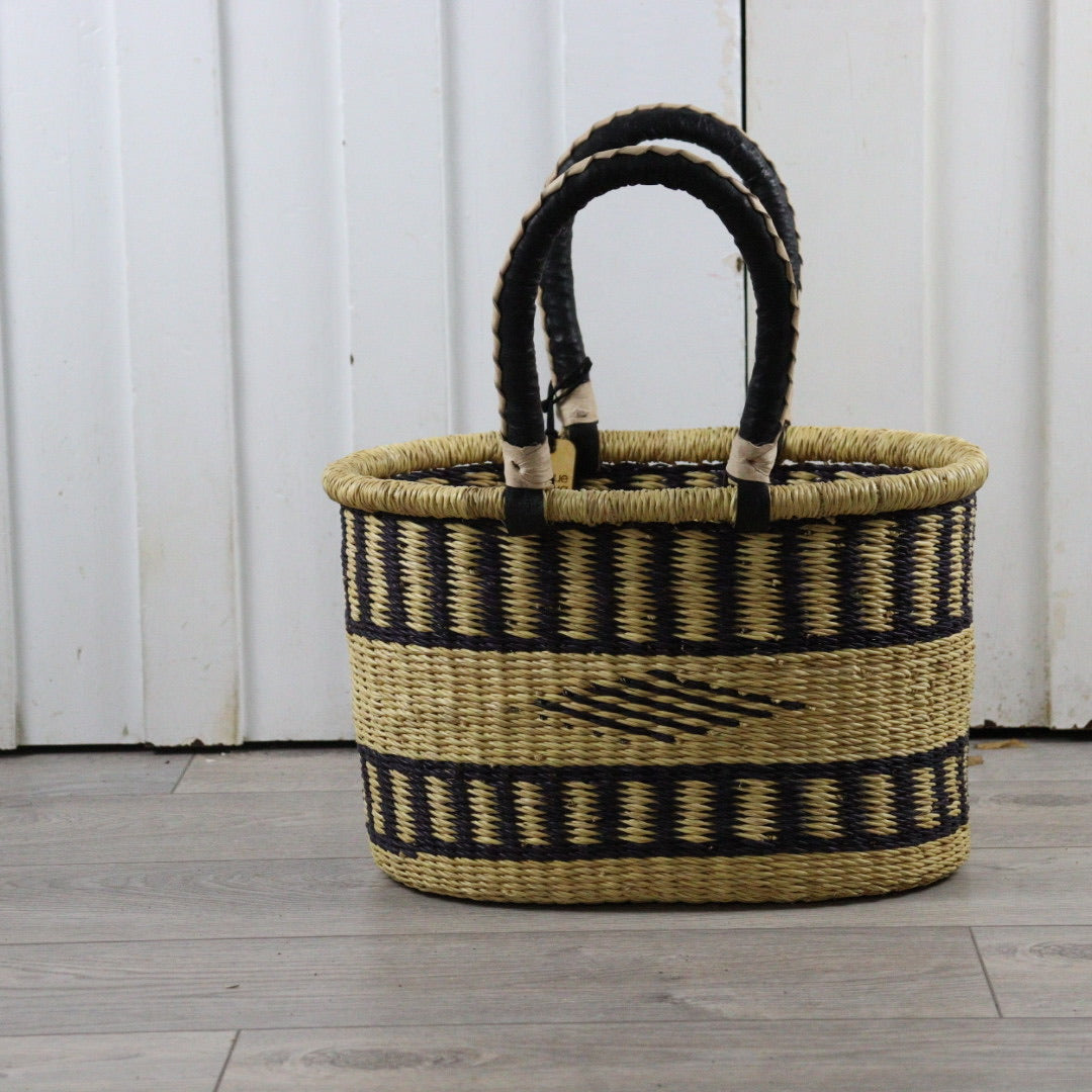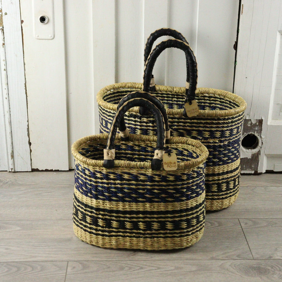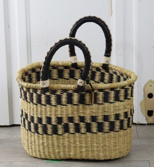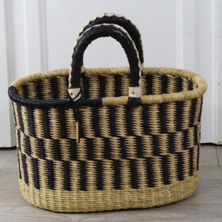 Oval Baskets come in three different sizes and when shipped from Ghana, they are nested. The Large is approximately 17" x 12" x 10", the Medium is 15" x 10" x 9" and the small is 14" x 8.5" x 9". Ovals are great for carrying jars, bottles and anything that has to remain upright.