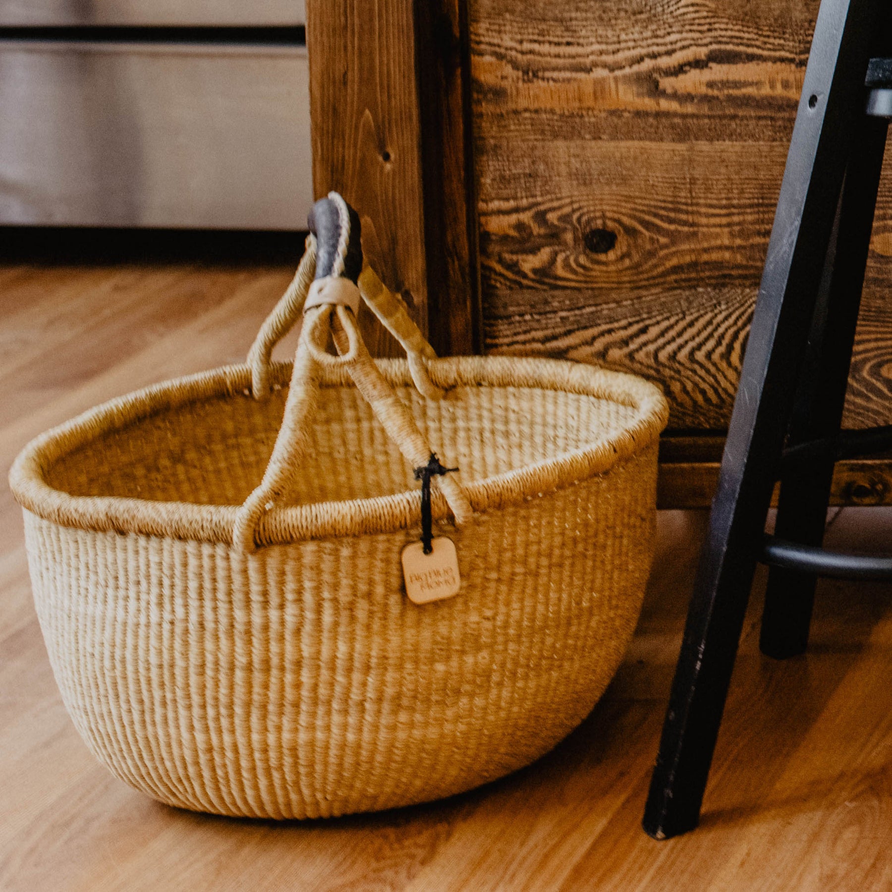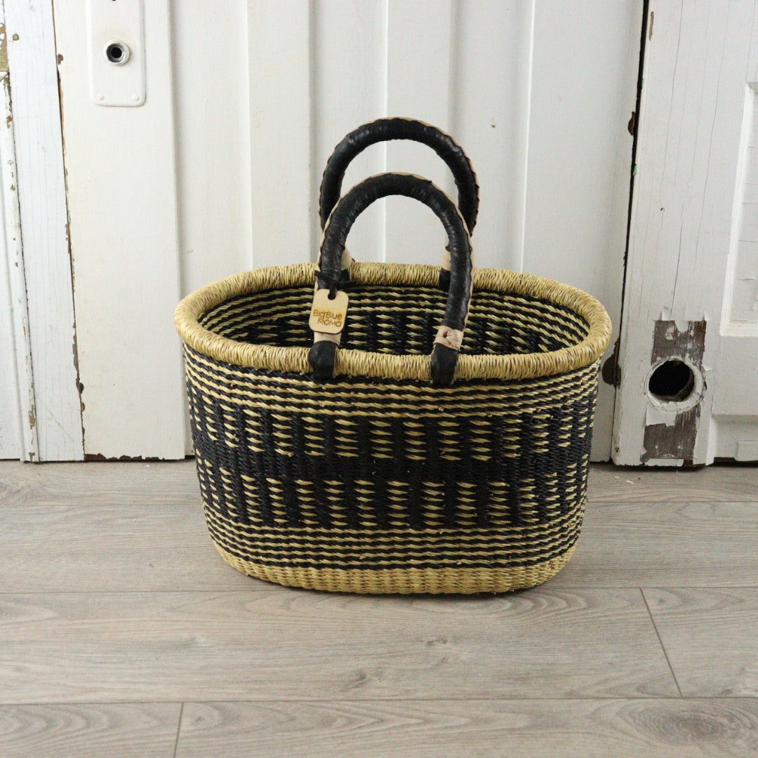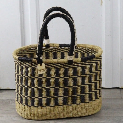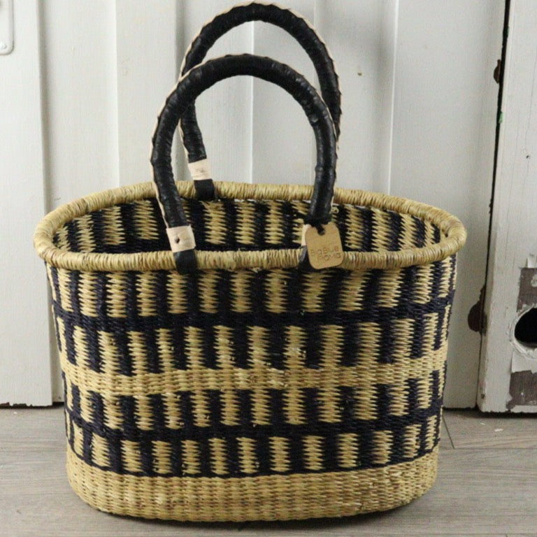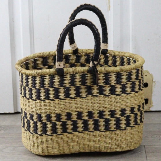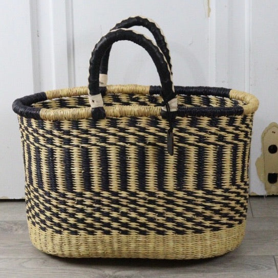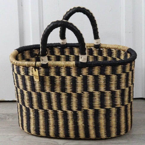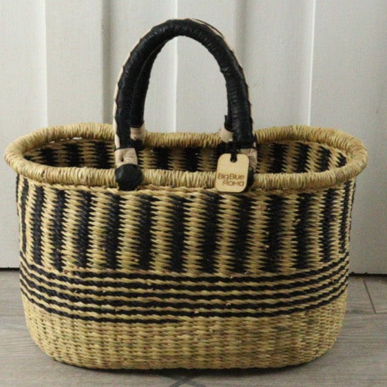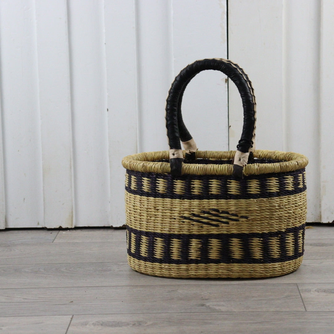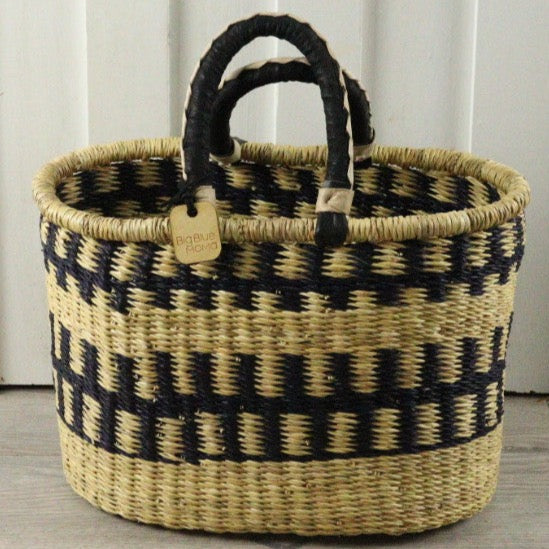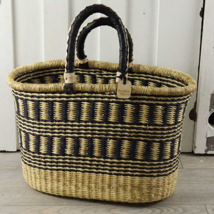 Oval Baskets come in three different sizes and when shipped from Ghana, they are nested. The Large is approximately 17" x 12" x 10", the Medium is 15" x 10" x 9" and the small is 14" x 8.5" x 9". Ovals are great for carrying jars, bottles and anything that has to remain upright.