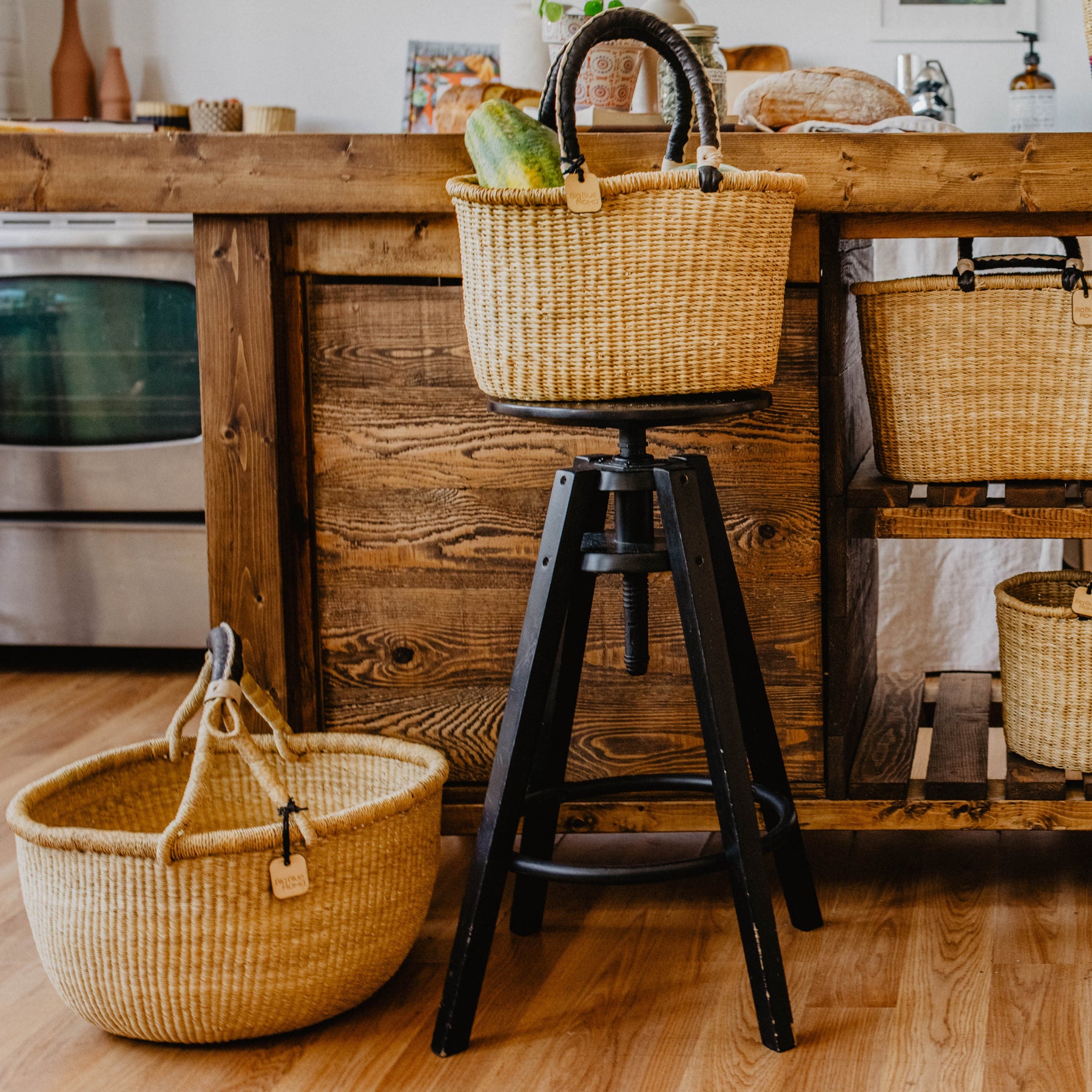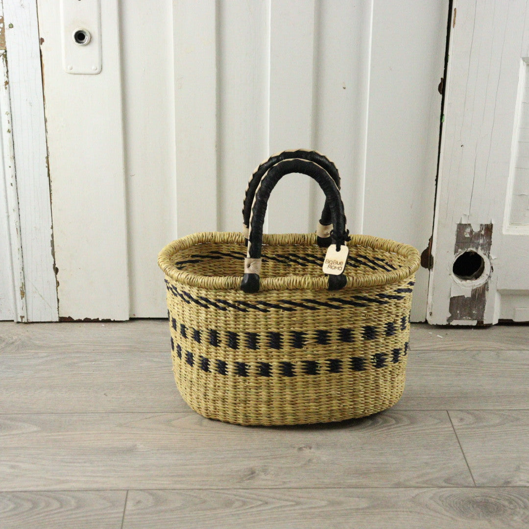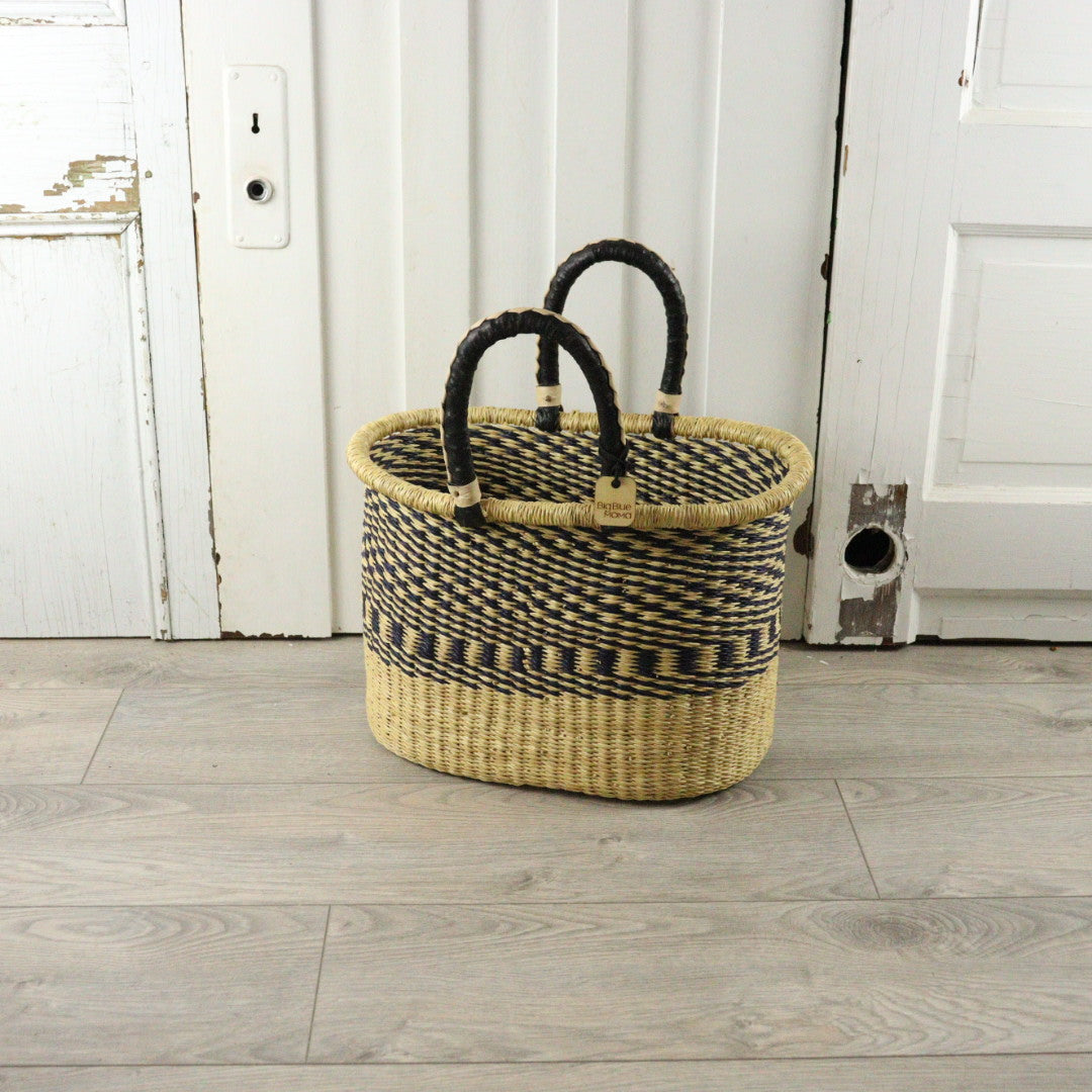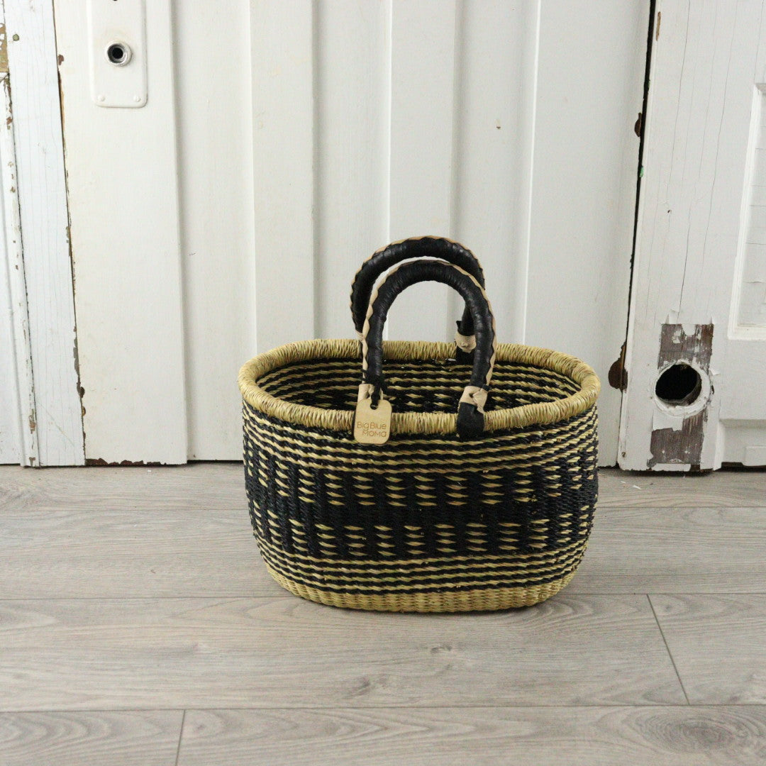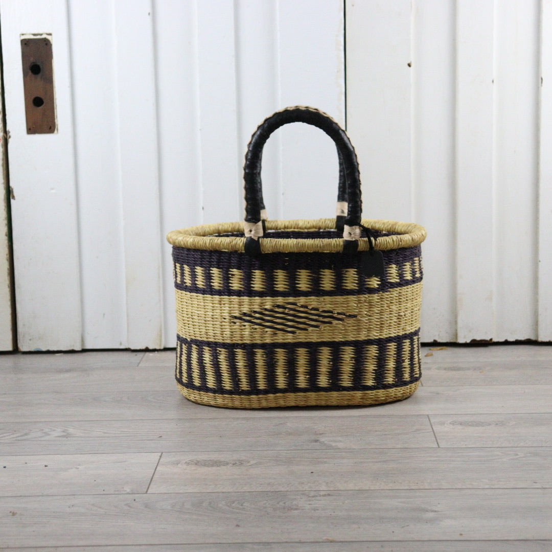 Oval Baskets come in three different sizes and when shipped from Ghana, they are nested. The Large is approximately 17" x 12" x 10", the Medium is 15" x 10" x 9" and the small is 14" x 8.5" x 9". Ovals are great for carrying jars, bottles and anything that has to remain upright.
