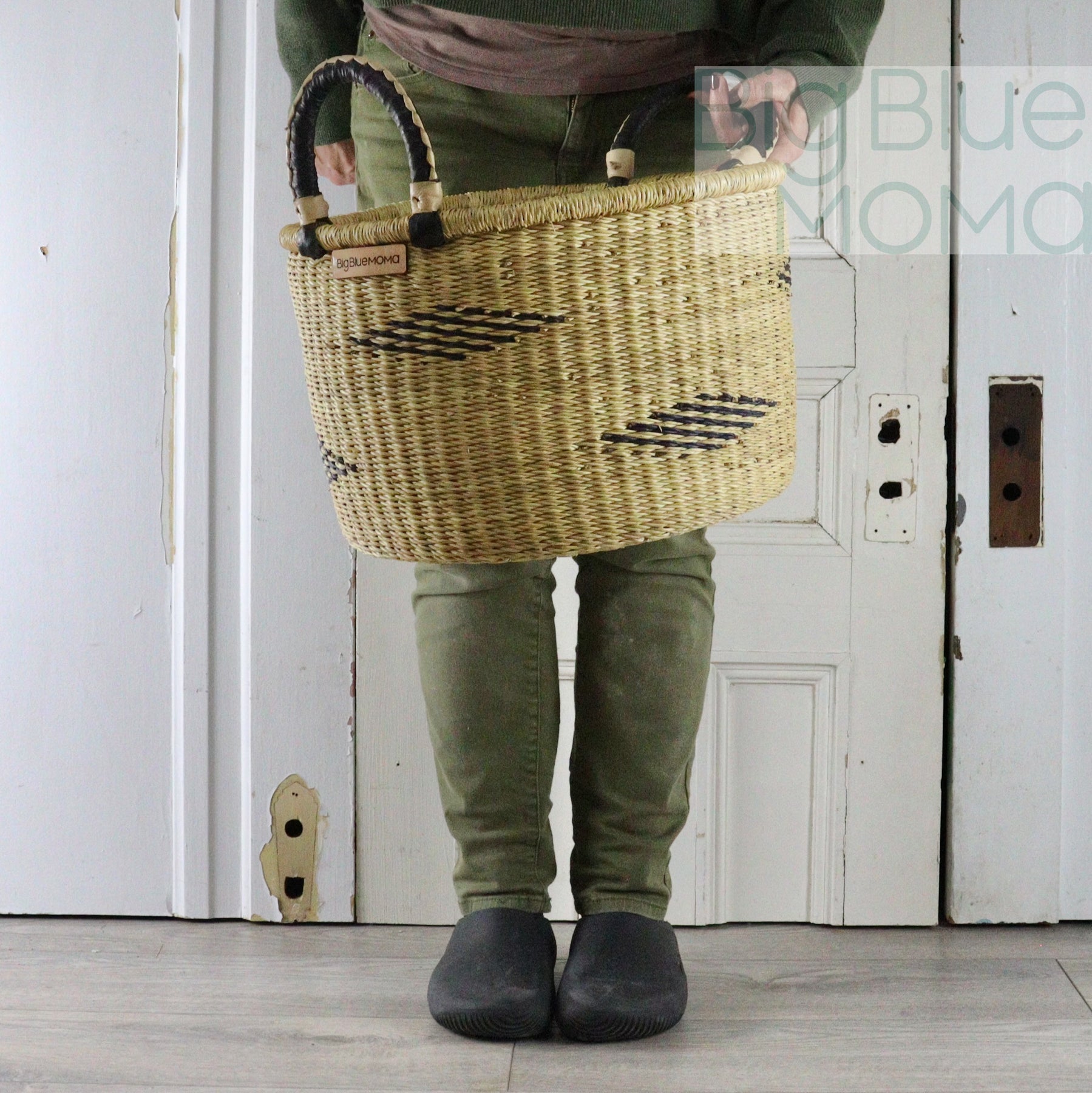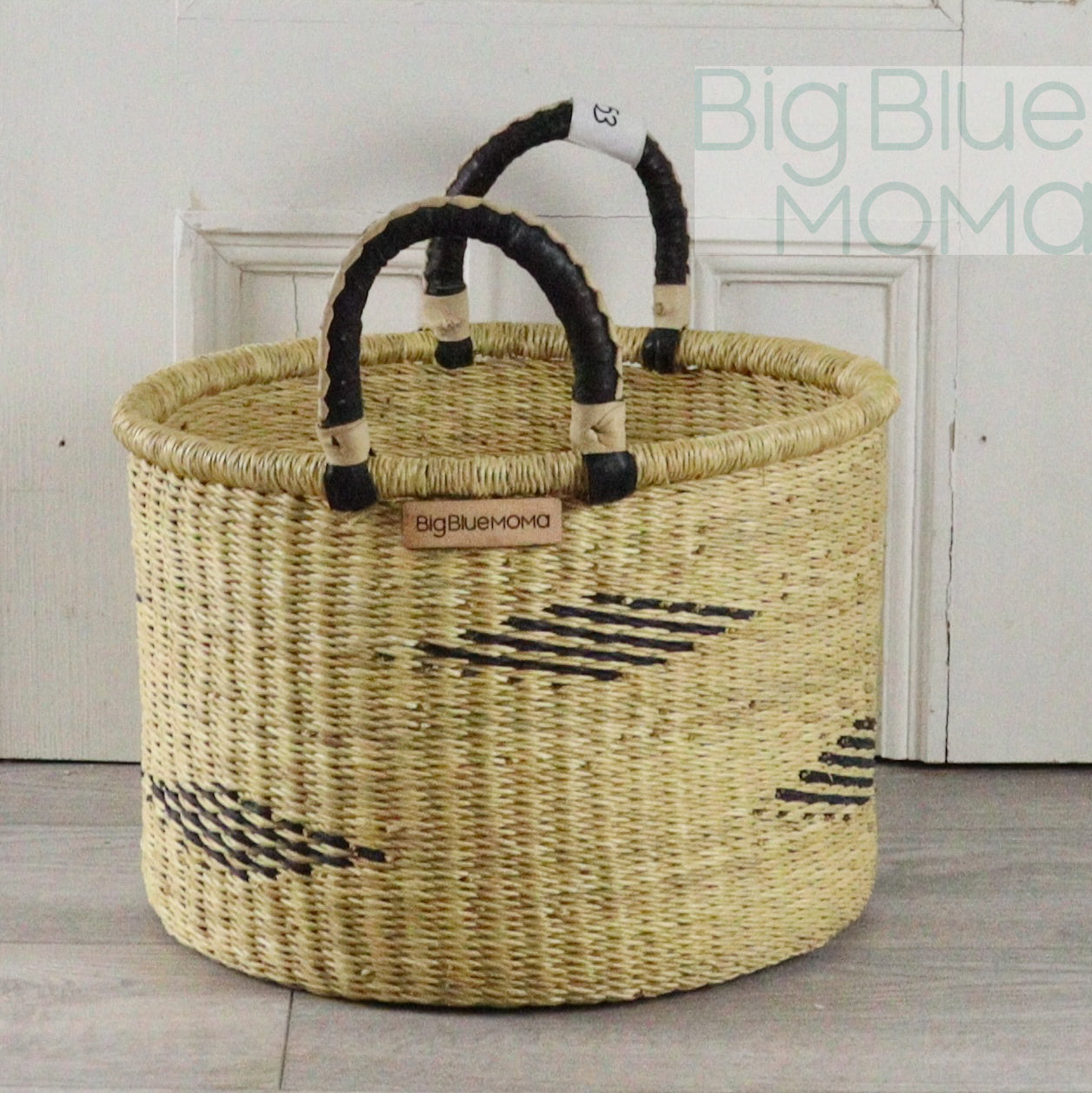 These handmade, hampers are practical for just about anything from laundry to dog toys to firewood. Sturdy construction and two handled design make it easy to carry large and heavy loads. All baskets are woven by hand with elephant grass indigenous to the Bolgatanga area of Ghana, West Africa. Handles are covered with goat leather reinforcing it's construction while also adding an extra level of comfort when carrying a full load.