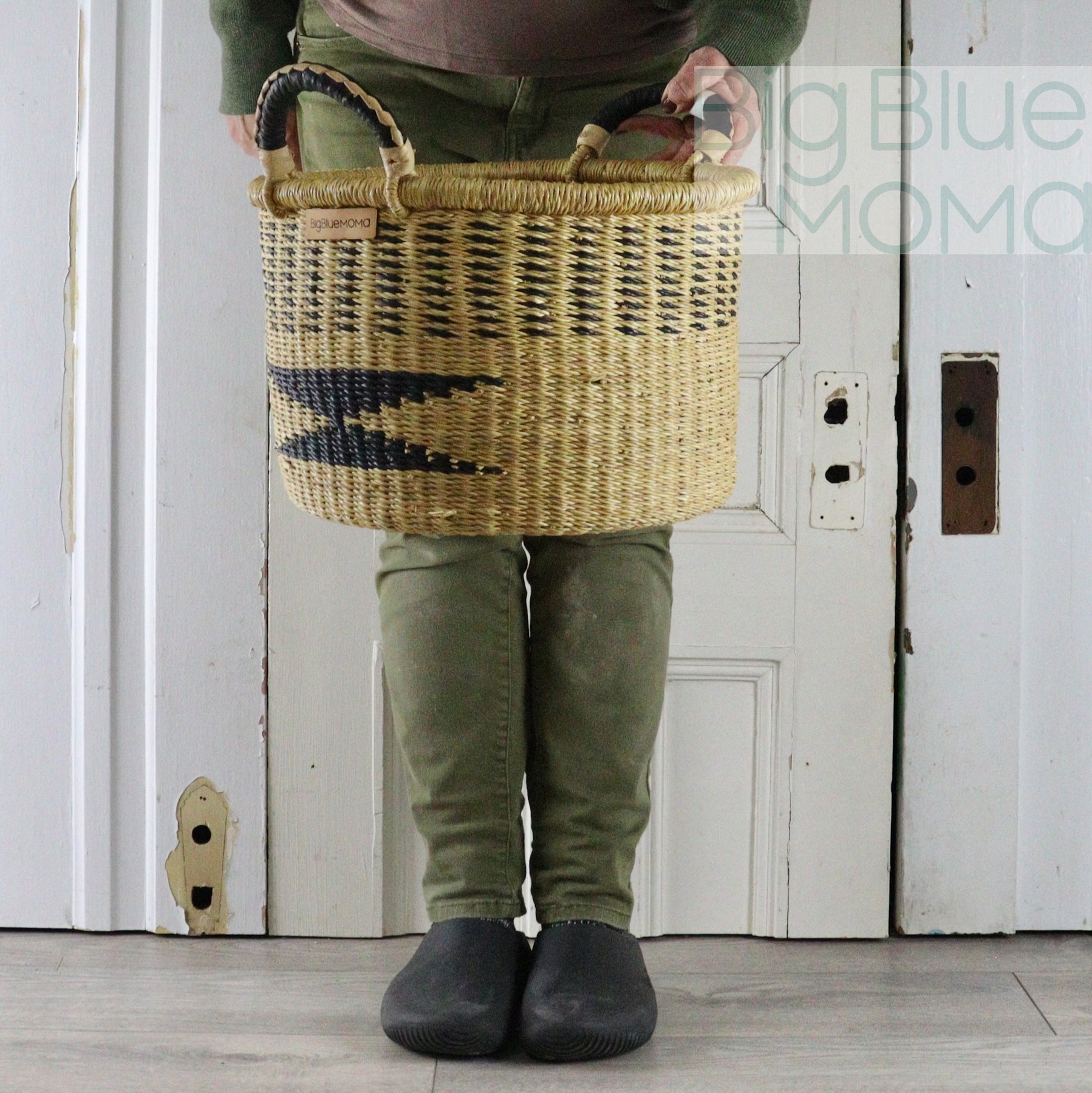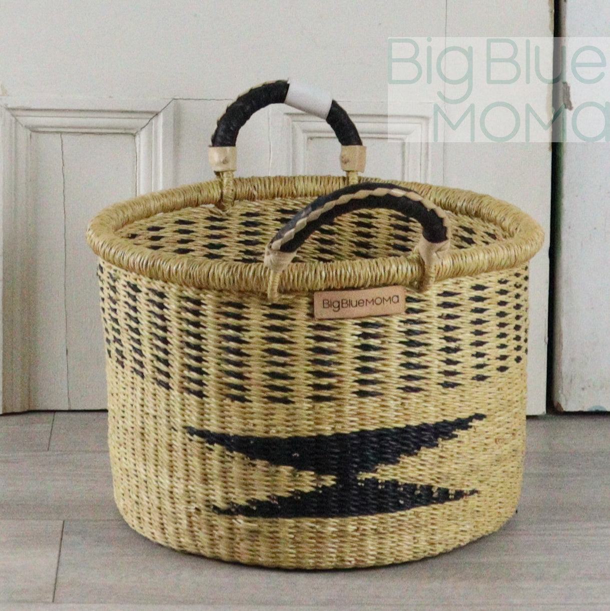 These handmade, hampers are practical for just about anything from laundry to dog toys to firewood. Sturdy construction and two handled design make it easy to carry large and heavy loads. All baskets are woven by hand with elephant grass indigenous to the Bolgatanga area of Ghana, West Africa. Handles are covered with goat leather reinforcing it's construction while also adding an extra level of comfort when carrying a full load.