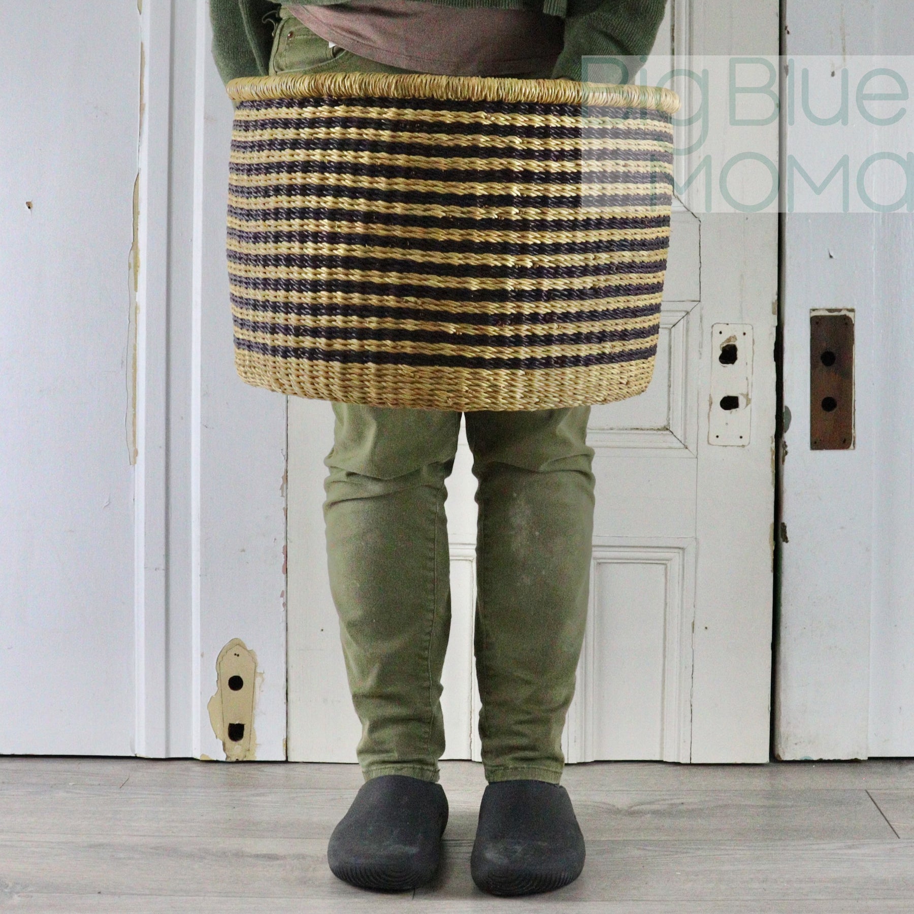 These handmade, hampers are practical for just about anything from laundry to dog toys to firewood. Sturdy construction and two handled design make it easy to carry large and heavy loads. All baskets are woven by hand with elephant grass indigenous to the Bolgatanga area of Ghana, West Africa. Handles are covered with goat leather reinforcing it's construction while also adding an extra level of comfort when carrying a full load.